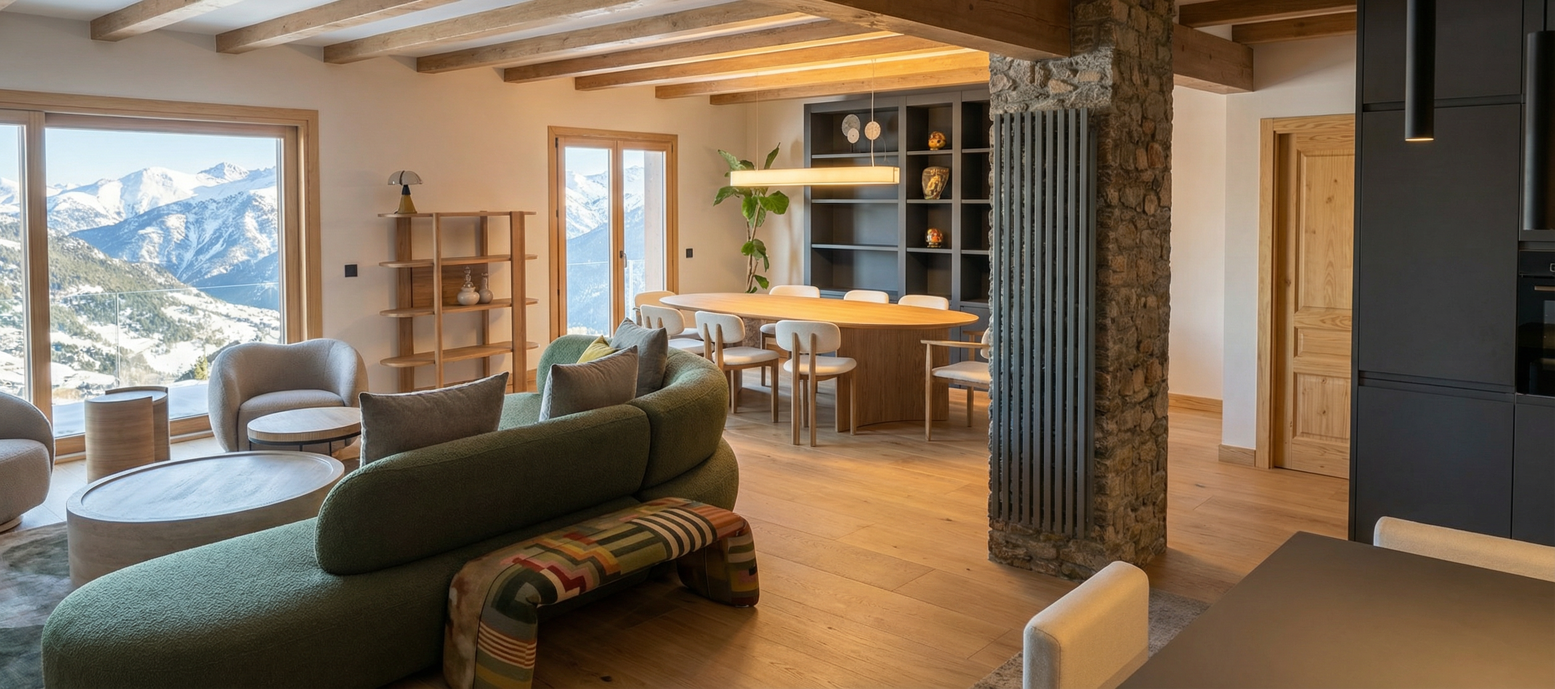 vistas a las monta as nevadas de andorra maderas en roble natural sofa textil verde militar maxima calidad hambiete calido y respetar los acabados