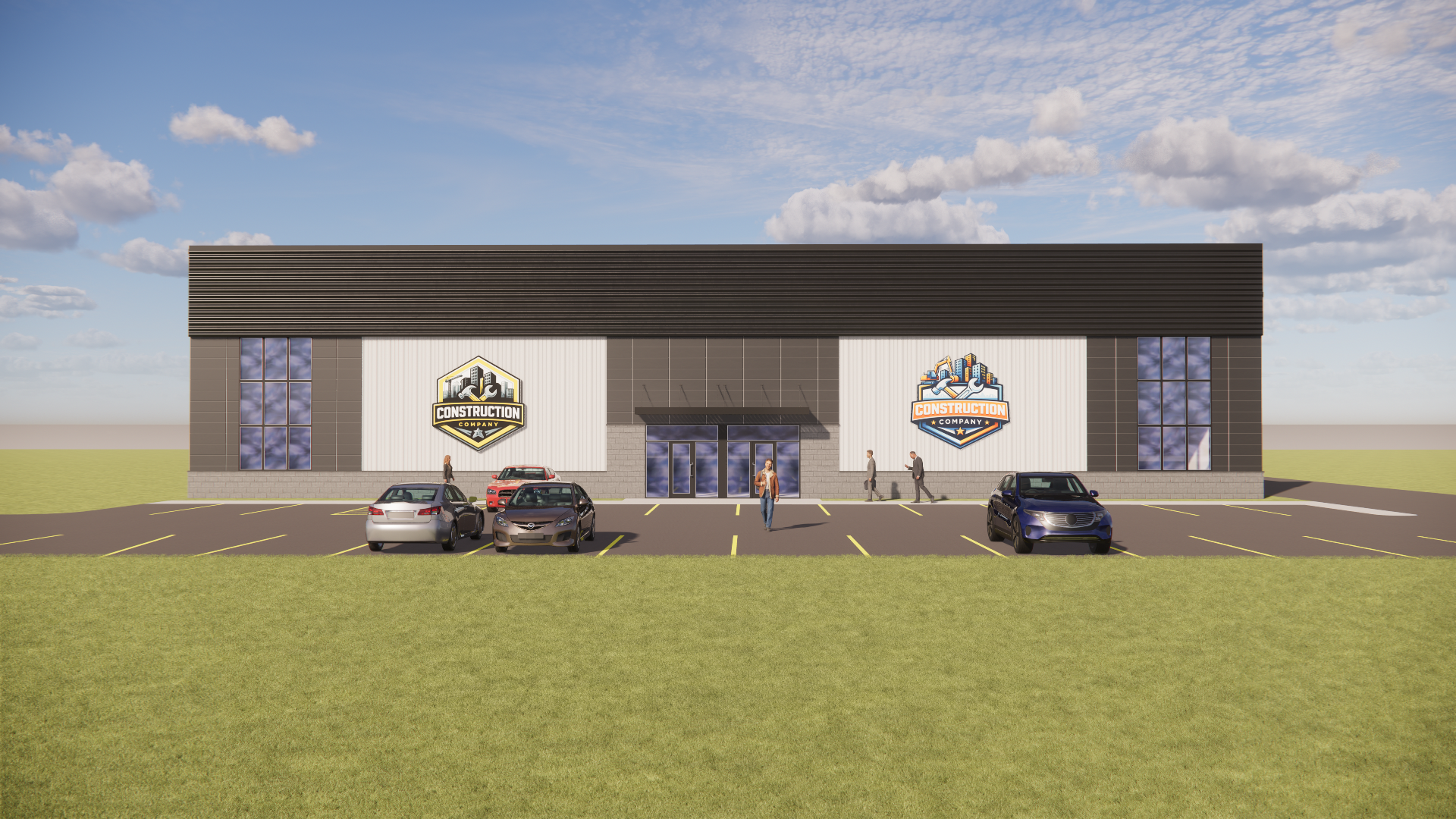 modern facility with metal siding light grey steel siding as shown with a black horizontal steel band at the top steel black flat awnings over front doors where shown 54 x16 dark grey metal paneling with white grout between around the windows and above the front doors grass lawn with an asphalt parking lot with cars and people as shown asphalt driveway extending to the back of the building keep everything as shown don t change doors windows siding colors etc show some smaller buildings in the far distance with a trees surrounding the building on a sunny day