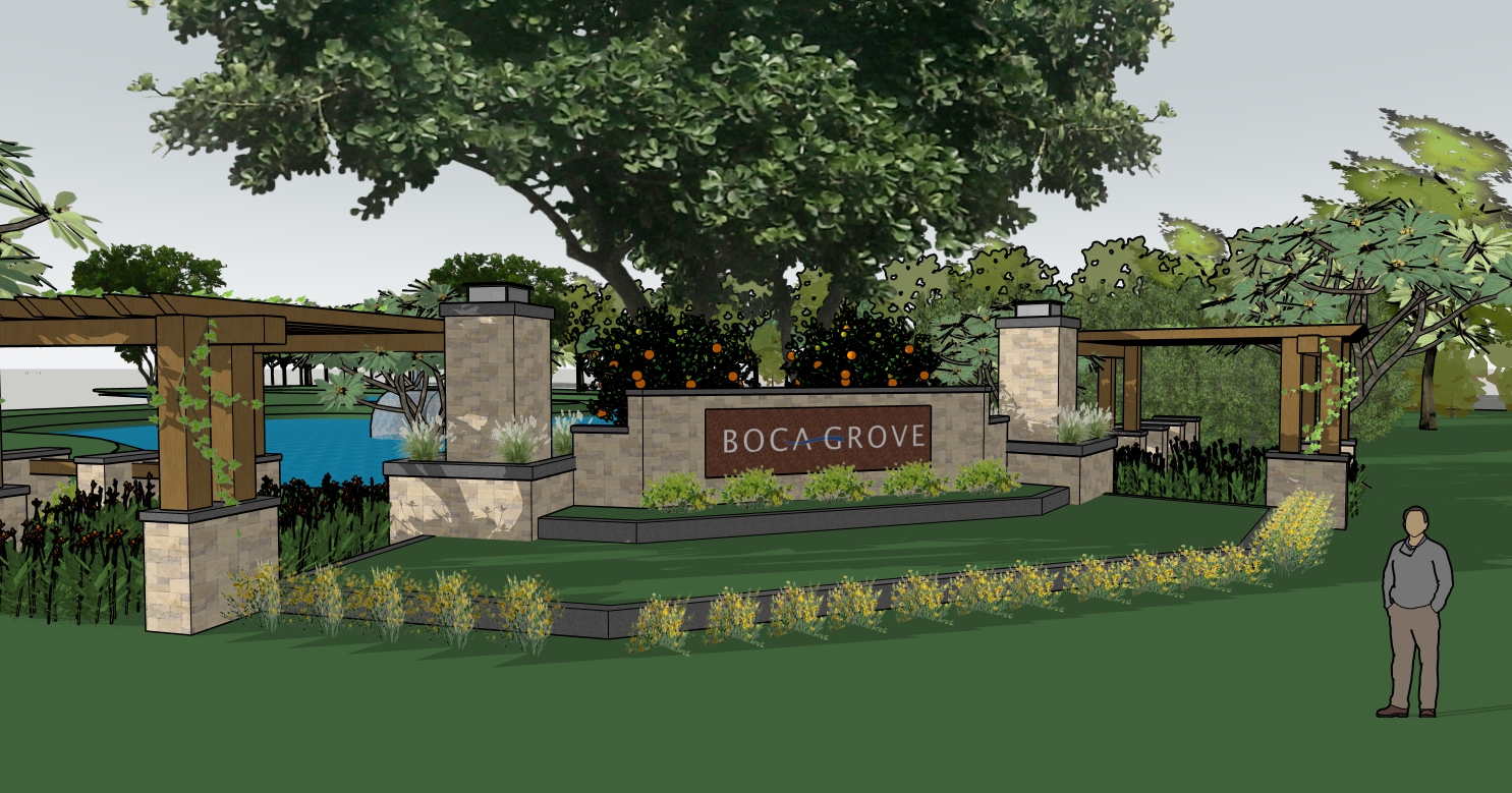 community entrance monumental sign south florida low small mixed ground cover afternoon sky lighting front area to remain as lawn
