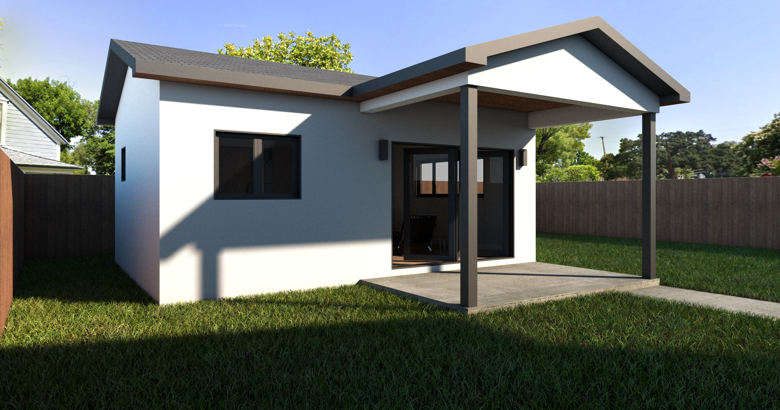 redesign adu with a modern look with an increased wider flat canopy that extends full width of adu make the canopy wider to the full width of adu do not show any beams exposed that support the canopy keep the posts