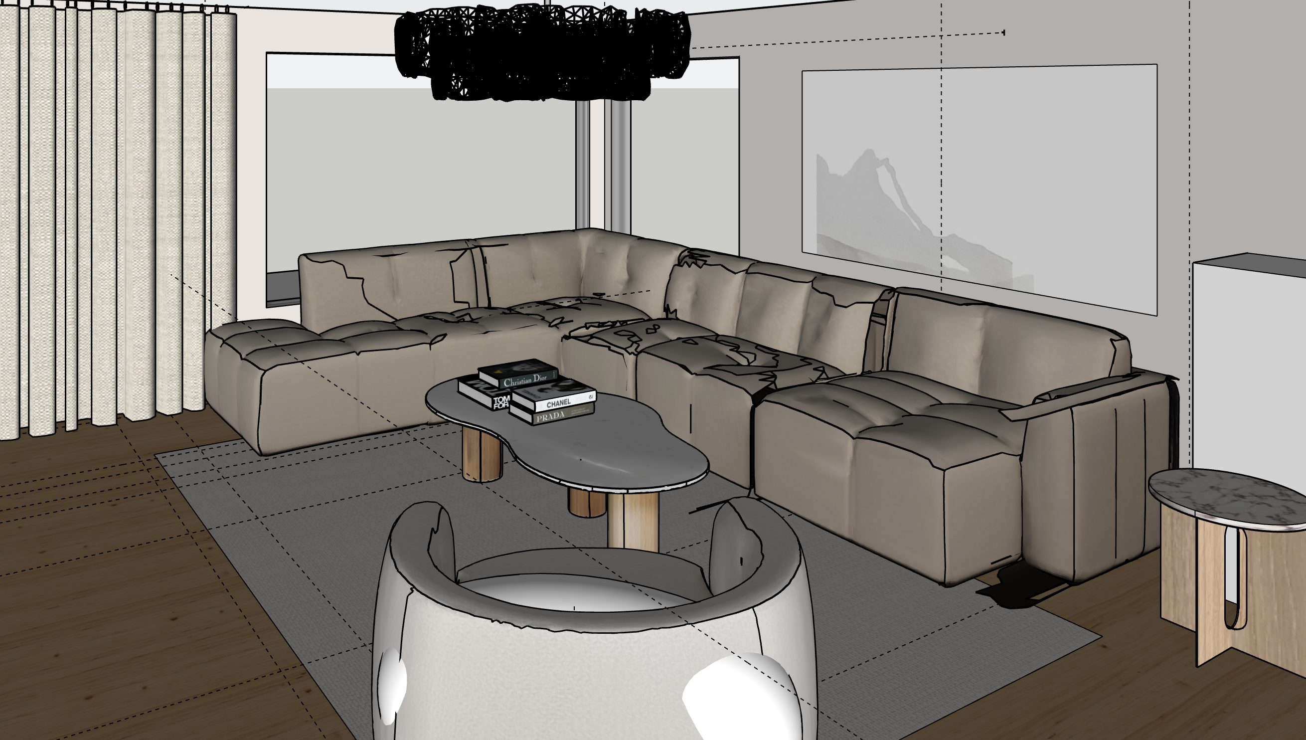 white boucle sofa and arm chair light greige wall color soft carpet table top is marble and table legs oak