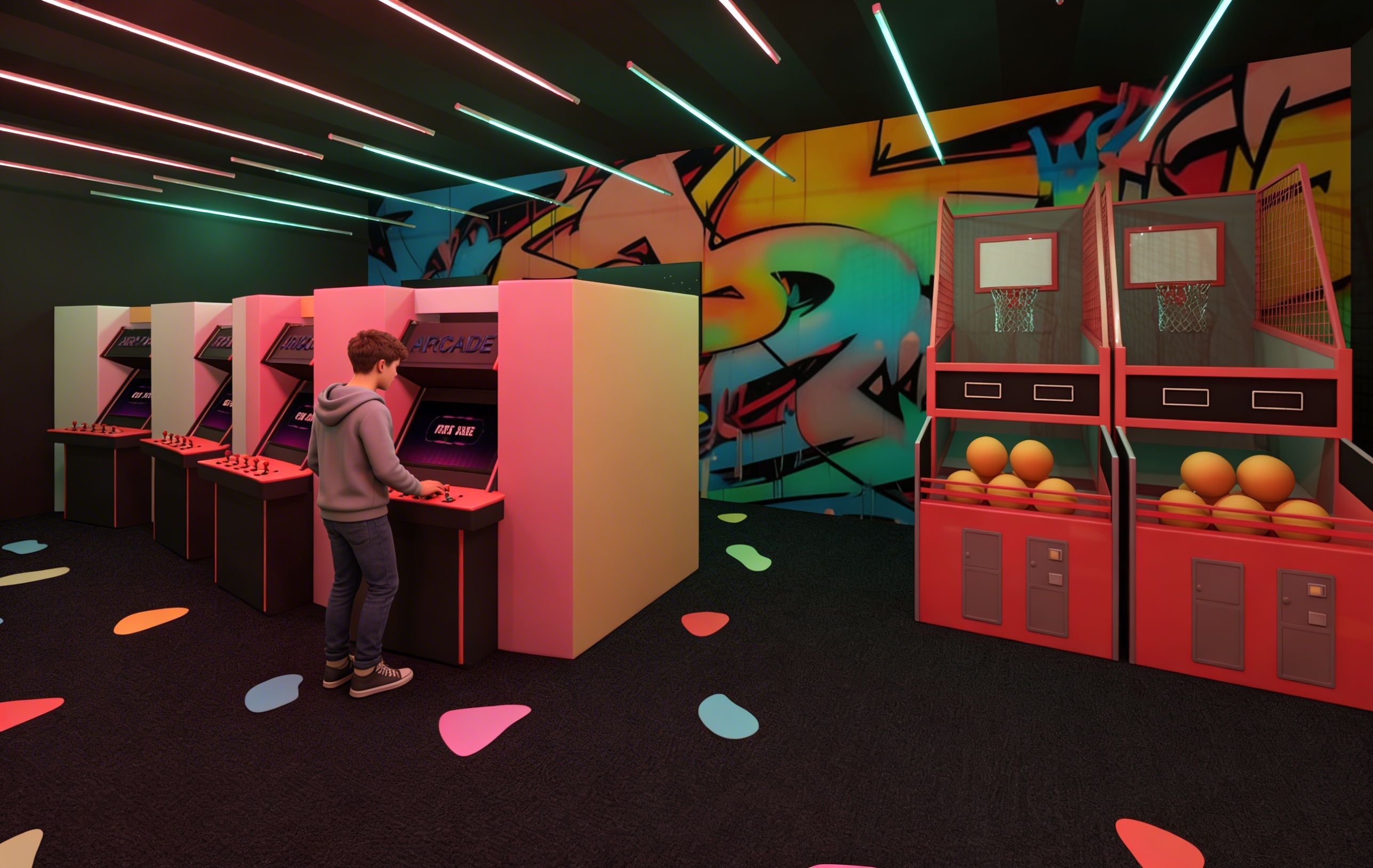add human teen figure at the arcade games without changing any materials or anything about the image