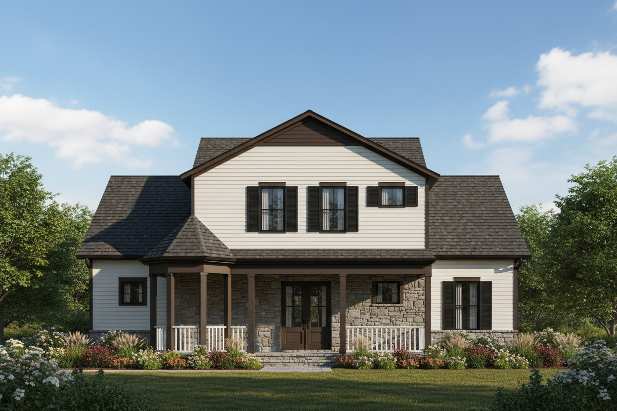 modernist exterior shot render a modern mountain house with a sleek design the walls should be a warm unfinished wood tone on the sides and a soft light grey stucco in the center with a black metal roof the windows are large and made of clear glass reflecting the greenery around there should be a wooden deck with a warm brown finish surround the house with vibrant green landscaping and a few delicate flowering shrubs in soft pink and white the atmosphere is serene and inviting with sunlight gently illuminating the facade surround the house with tall coniferous trees architecture