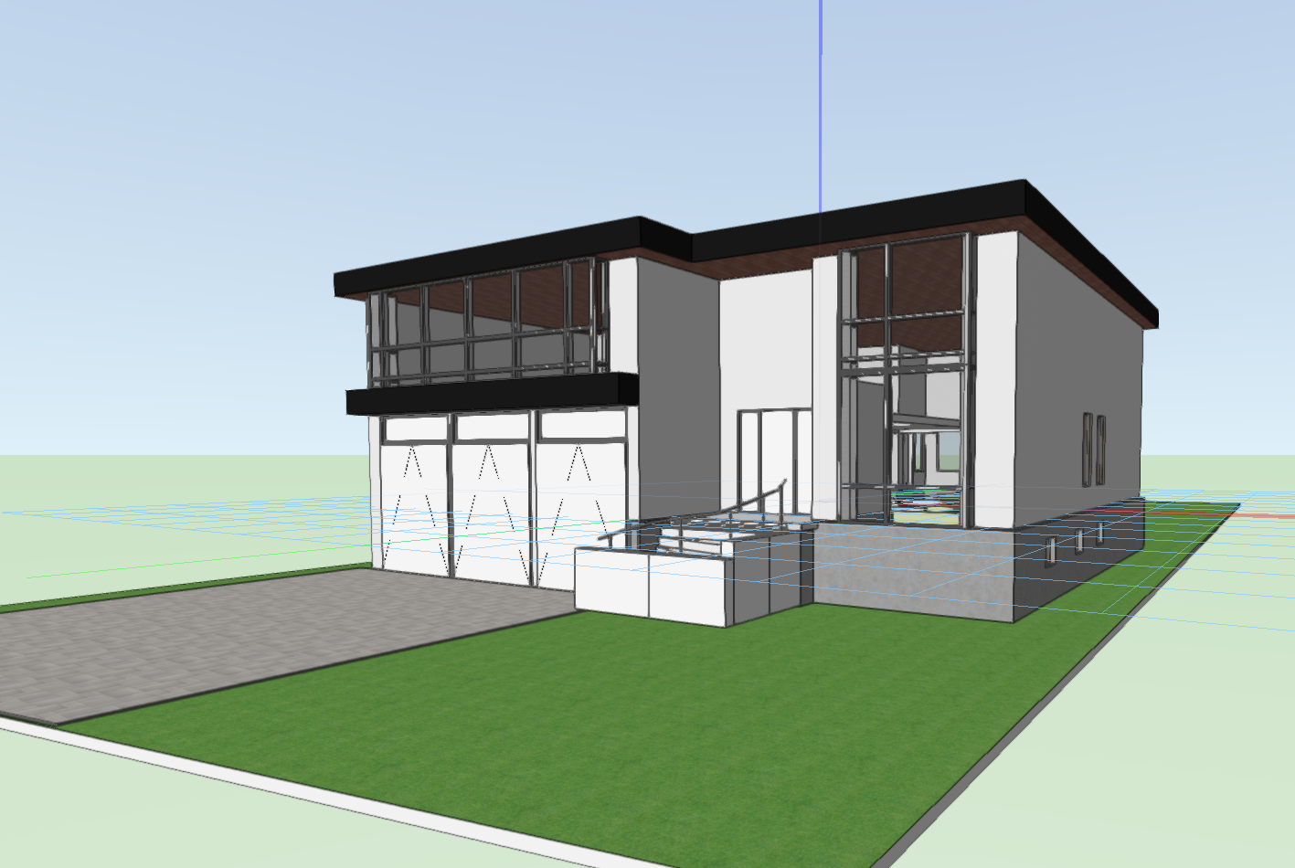 a modern two story house with large glass windows the exterior walls are stucco in a sleek white color complemented by a flat black aluminum roof the driveway and pathway are made of smooth gray concrete cedar garage doors the surrounding lawn is lush vibrant green and well manicured the atmosphere is serene and ambient capturing the house bathed in warm golden sunlight with a clear blue sky overhead
