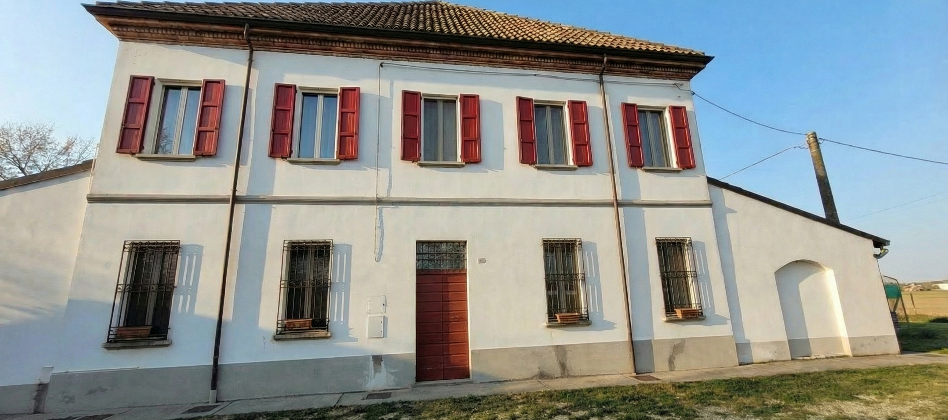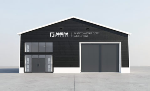 a visualization of the production hall that preserves the existing building structure and the layout of windows and doors the gate on the right opens to the right through the gate you can see inside the hall where the production of frame houses is underway an office is visible in the reflection in the window on the left the door on the left is to be made of glass please add a realistic environment around the hall sidewalks greenery access roads and a parking lot while maintaining consistency in perspective and lighting without altering the building s structure