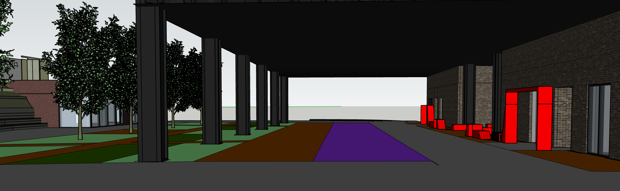the covered space should function as an urban passage on the right side next to the building add restaurant tables include people and bicycles on a rack add material textures to the ground surfaces these should be modern paving slabs and cobblestones the purple area is a zone where no benches or fixed elements are allowed in the brown zone near the columns add modular modern double sided benches positioned so that one side is on the grass and the other on the pavement add attractive urban greenery in the designated green areas light green should represent low vegetation grass and dark green should represent taller shrubs and flowering plants i would like various seating elements within the grass such as chairs and deck chairs with people sitting in them in the purple zone add temporary stands with coffee and ice cream also add that the ceiling should be mirrored with linear suspended industrial style lighting fixtures