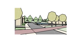 generate hyper realistic visual but with artistic flare of this cad model dont change the view but just make it look real the first triangle of beige is a pedestrian footpath and cycle path the second close to the houses is a quite road to feed a few houses add in a car make the trees look natutal and the architecture whilst seocondary to the landscape led feel of the scheme to be a mixtire of uk vernaacular architect of black timber cladding brick and flint grey slate and red tiles roofs brick and muted render on the buildings there is a swale through the middle of the picture and this is to be planted with wild planting and flowers and the grass to look natural make the image aspirational and classy with an artist impression type style make all planting wild flower only nothing domesticated or curated in a garden fashion the blue area is a elegant balancing pond with wild planting jetty and wile flowers around it make trees realitic the road is a light grey colour but the intrsecting more brown road is a resin bounded buff colour finish dont change the building positions and make this place an aspirational development