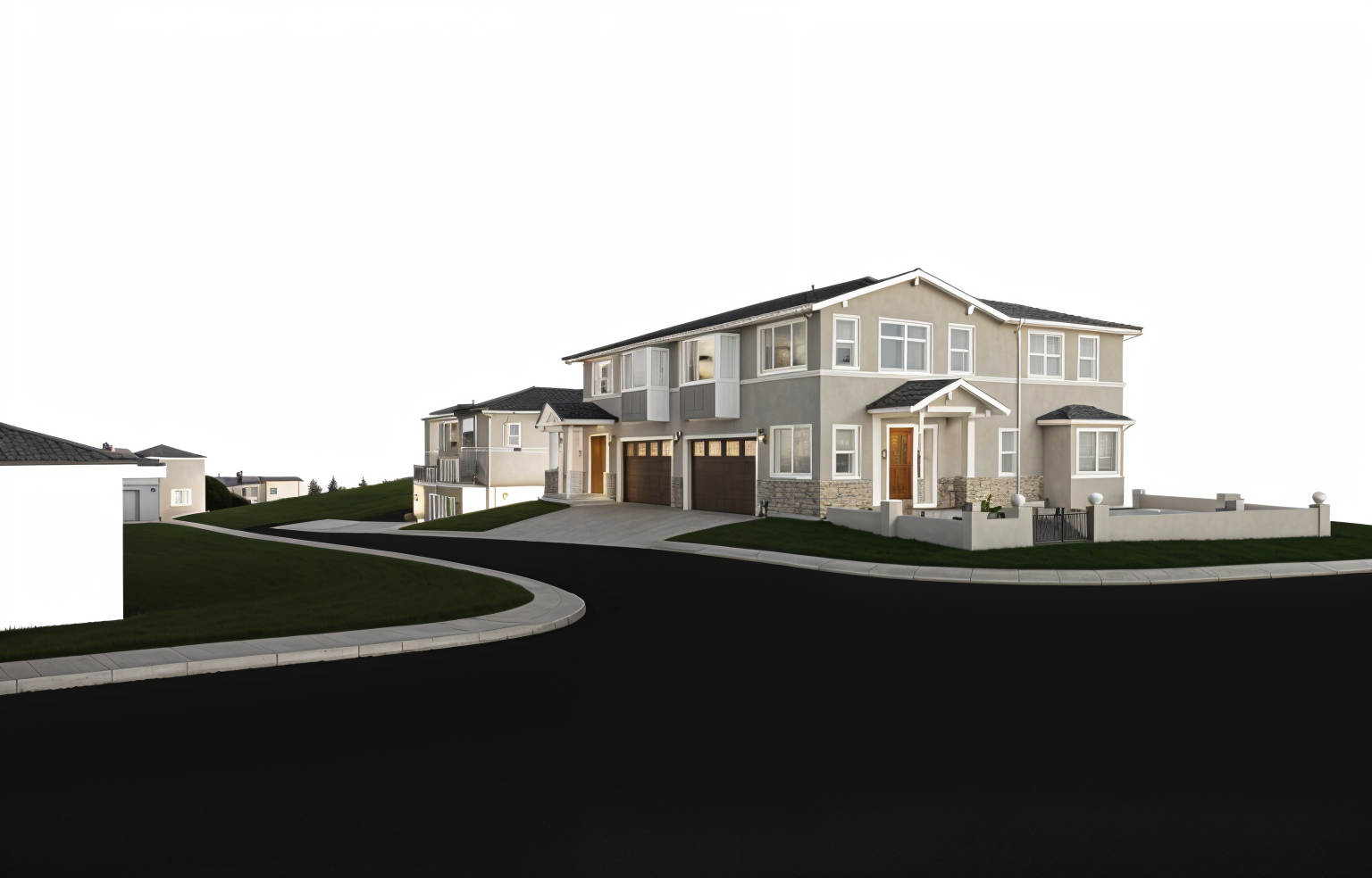 modernist exterior shot use arizona desert with mountain in the background stucco walls color tan left side is a 2 car door garage with a car infront next to that wall is popped out and the next wall is pushed back the tower entry is slightly pushed back from the wall to its left and the next wall with patio is pushed back after architecture