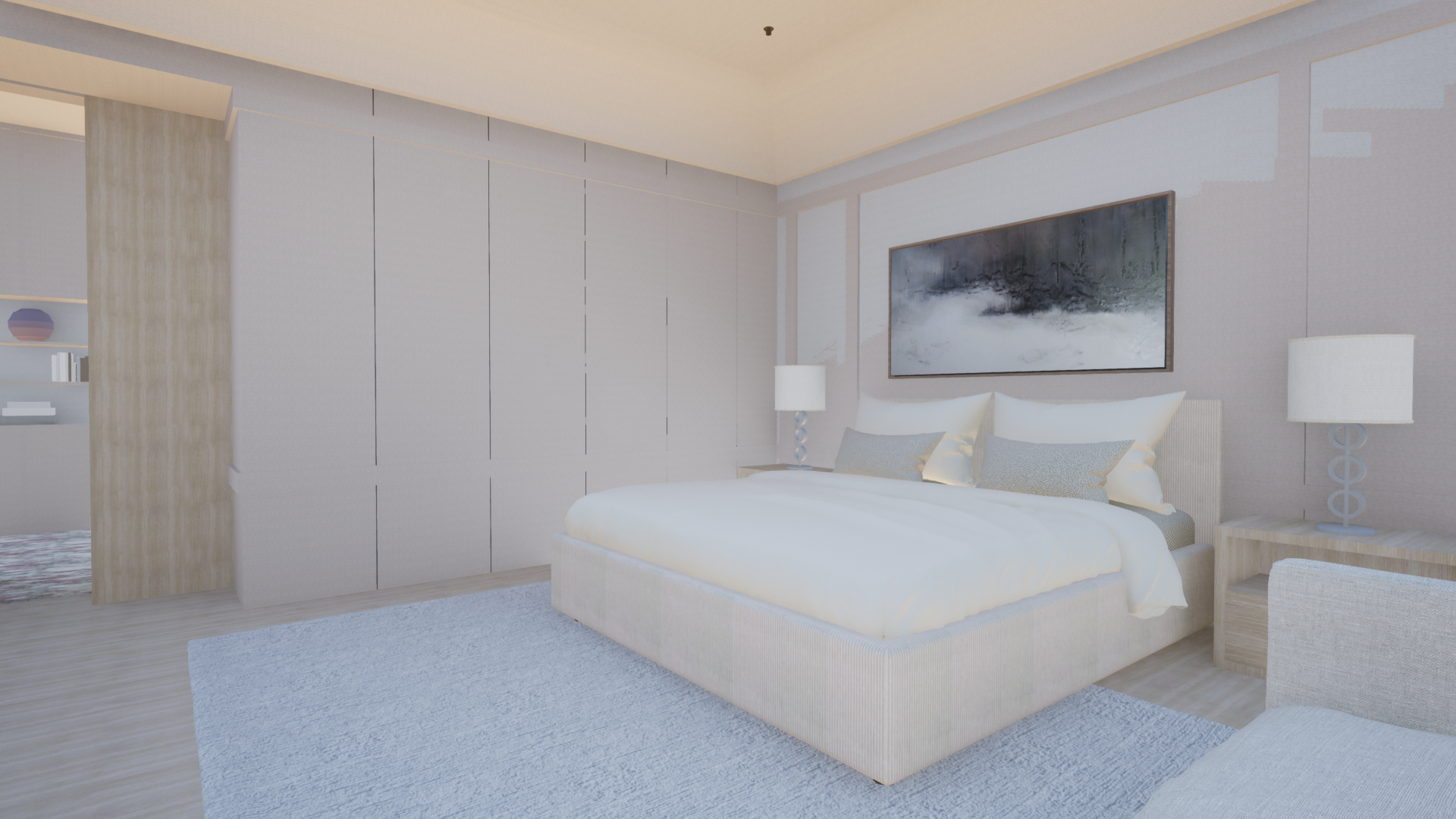 interior shot turn this concept shot into a polished render the color scheme is neutral tones with a touch of light green to be used in the throw pillows as well as an olive green throw to be placed neatly along the bottom width of the bed the far wall is made up of hidden cabinets the same color of the wall with the same horizontal panel going across it and behind the cabinets is the main door to the room which is a pocket door made of light oak wood the flooring is also light oak wood parquet but make it slightly lighter than the door the rug can be beige and light olive green in a subtle pattern the bedding is made of shades of beige in a soft fabric the painting can have a more interesting brass or wood frame and the lamps can also be more interesting in brushed antique brass or wood the ceiling has curved edges with a warm cove light pointing to the center of the ceiling and there is one trimless spotlight in the corner of the ceiling the walls have paneling on them as you can see just make them clearer with shade and shadow the walls trim and ceiling are the same ivory off white color