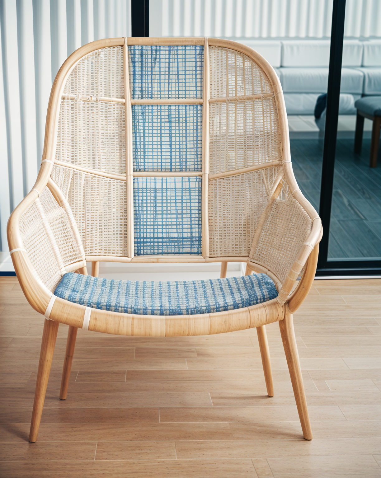 modernist perspective shot upholstered seat and back weaving inspired chair wooden legs finish architecture