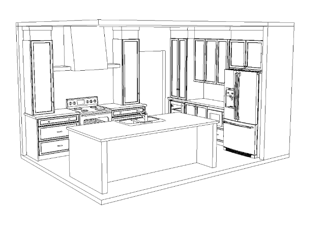 interior shot take this kitchen drawing and create a walnut wood island and walnut cabinets on either side of the hood facade keep the fridge wall cabinets a warm white and make the hood facade and floating shelves a warm white
