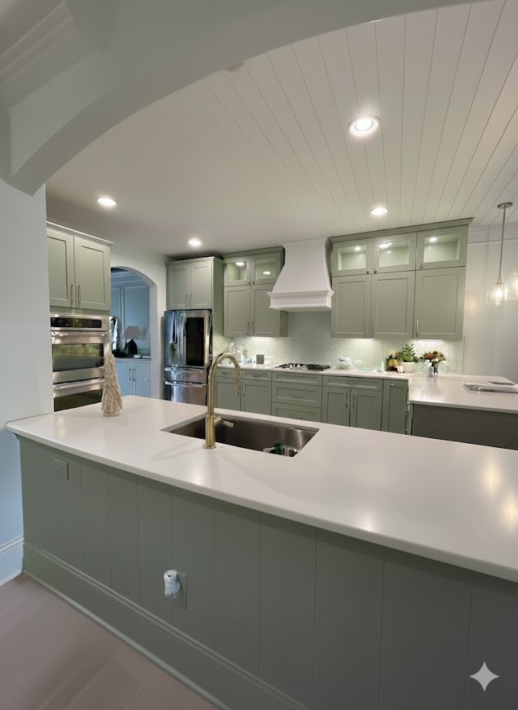 add a white oak stained hutch wall cabinet on the right end of the back wall countertop to ceiling with glass doors