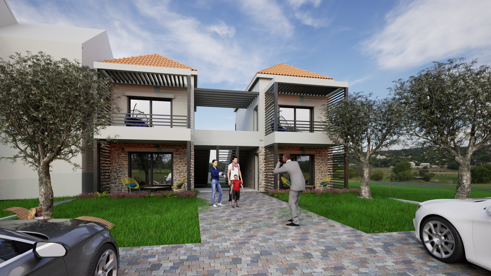make realistic add short and small mediterranean vegetation at the grass add curtain behind glazed windows keep geometry