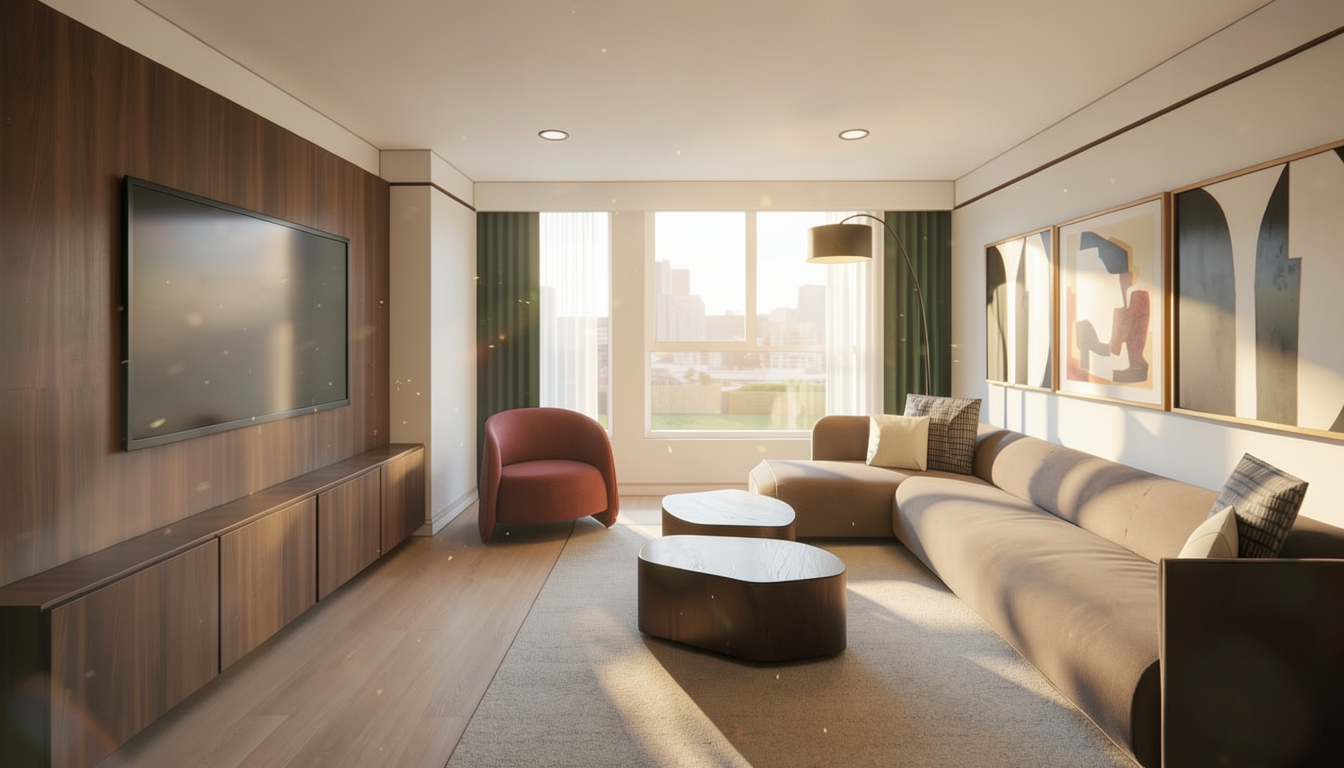 modern minimalist house surrounded by lush green trees and tropical landscape the exterior features a blend of warm beige and natural stone textures the pathway is a soft grey cobblestone leading to wide wooden doors vibrant green foliage accents the roof and the periphery creating a serene tranquil atmosphere the sky is a clear blue with a hint of soft pastel hues at the horizon the overall scene is peaceful and inviting with gentle morning sunlight casting soft shadows
