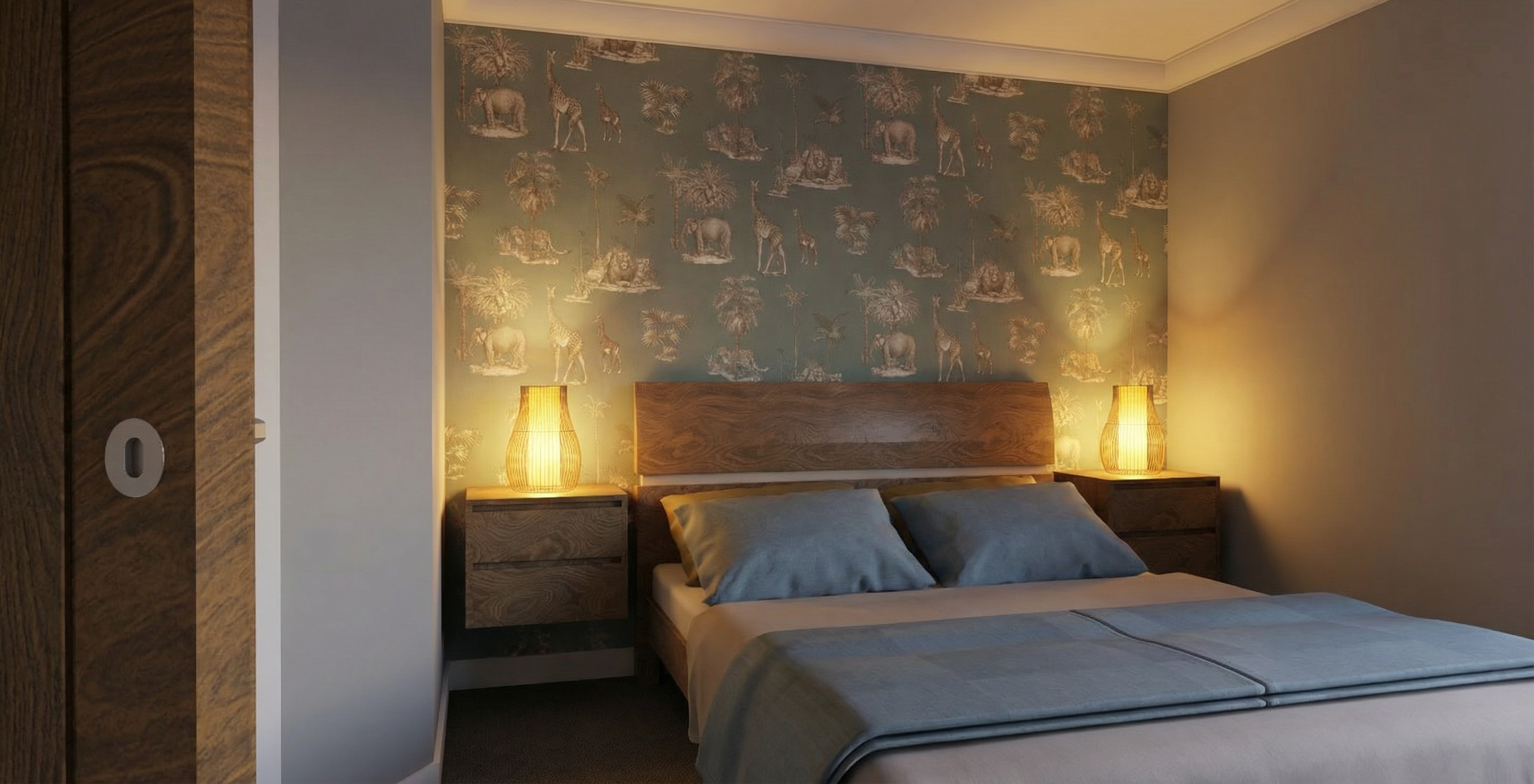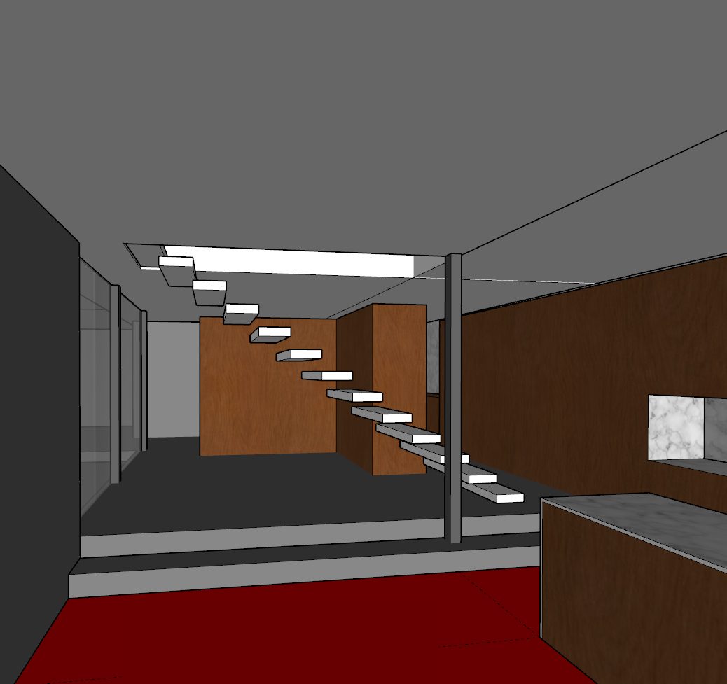 interior image important do not change or modify the base geometry in any way reference clarification all color indications mentioned below such as red floor dark floor brown wood etc refer only to the reference image and are used to identify elements they do not indicate the final color unless explicitly stated this clarification applies to all similar instructions architectural photography approach the render must be treated as a realistic architectural photograph not a conceptual image use a natural camera height and a controlled perspective keep vertical lines straight no distortion avoid exaggerated wide angle lenses focus on materiality light and spatial depth lighting should feel natural calm and architectural with soft contrasts and realistic shadows materials elements floor marked in red reference image polished concrete floor with visible polished and vitrified aggregate in a light gray tone dark floor reference image wood flooring with boards running lengthwise toward the camera using a light wood tone brick wall white brick ceiling white painted wooden boards boards running lengthwise toward the camera the ceiling must continue upward through the stair void columns white windows white window frames staircase wooden staircase with a white steel structure underneath centered include a very light and minimal railing allow a beam of natural light to enter through the stair void place planters with monstera plants under the staircase lighting install white track lighting throughout the space lighting should be soft indirect and architectural avoiding harsh or decorative effects furniture marked as brown wood reference image all furniture must be light oak wood the entire right side of the space is composed of built in furniture there are no windows along this entire wall furniture layout behind the staircase built in furniture unit the front facing unit includes a tv niche place a television inside the niche position a sofa with its back facing the staircase oriented toward the television overall atmosphere scandinavian calm and warm in front of the staircase toward the camera slightly shifted to the right place a kitchen island with a carrara marble countertop to the left of the island place a dining table positioned toward the camera on the left wall place framed artwork exterior relation light through the windows allow trees to be partially visible outside exterior light entering the interior should be soft and subtle creating a gentle natural ambiance without strong contrast