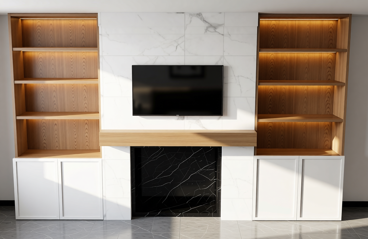 copy the paneling style of the reference photo onto the current fireplace while keeping the shelves looking how they currently are