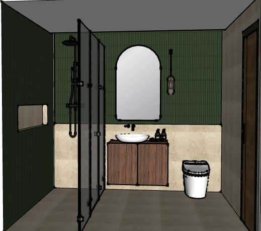 toilet and bath render in realistic do not change wall finishes and fixtures make the glass partition clear add ceiling lights architecture