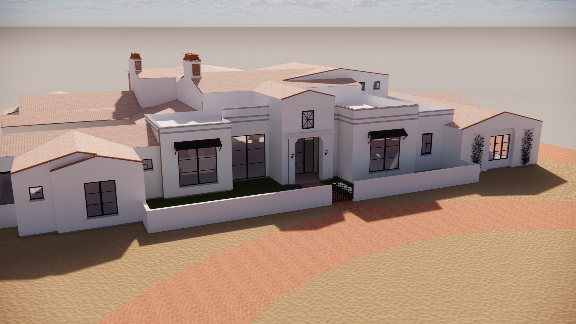 photo quality spanish style home in phoenix arizona the blue skies are partly cloudy at 4pm and there is a lot of accent lighting in the front sandy areas add lots of desert plants show some furniture inside the house