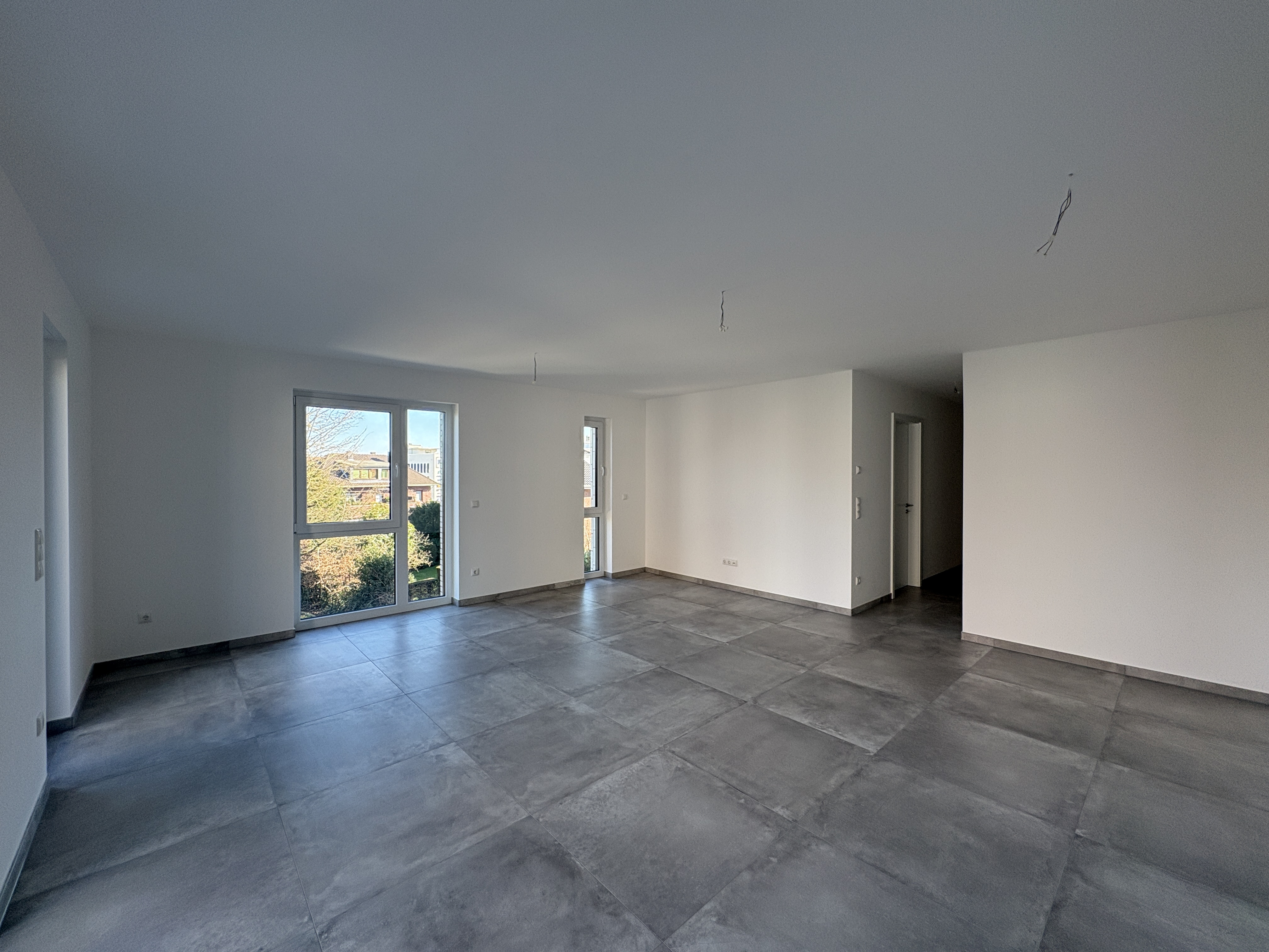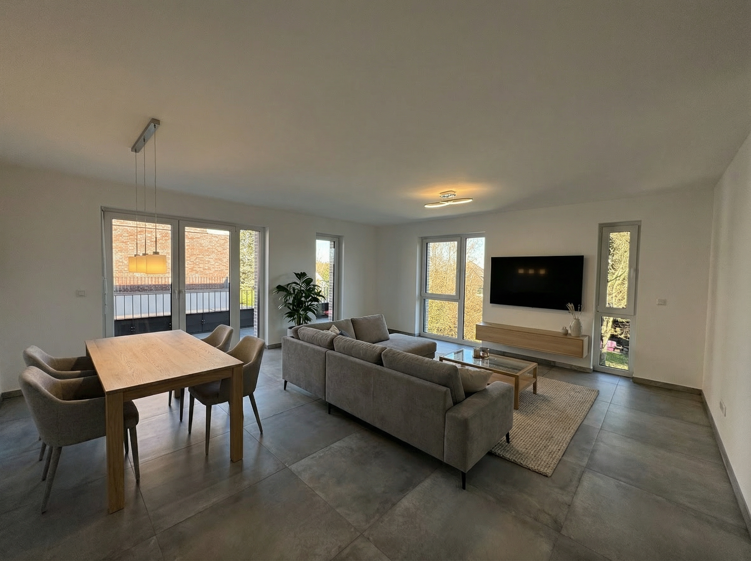 verwende das bereitgestellte bild des wohn und essbereichs als exakte basis bearbeite oder ver ndere das bestehende bild nicht keine nderungen an w nden b den decken fenstern t ren beleuchtung perspektive geometrie oder kamera winkel f ge nur moderne hochwertige gem tliche und minimalistische m bel und lampen ein die perfekt in den raum passen mit realistischen schatten reflexionen und proportionen die zur vorhandenen beleuchtung passen stil modern minimalistisch hochwertig gem tlich reduziert in neutralen t nen wei beige grau holz schwarz als akzent m bel und lampenplatzierung rechts an der wand gro er flacher led fernseher 55 65 zoll rahmenlos schwarz an der wand montiert optional auf einem sehr schlanken hellen tv board direkt gegen ber dem fernseher exakt parallel zur tv wand gerade oder l f rmige graue stoffcouch mit niedrigen armlehnen und weichen kissen so ausgerichtet dass die sitzfl che direkt auf den fernseher blickt perfekte tv sitzposition vor der couch schlichter niedriger couchtisch in holz oder mit d nner metallstruktur und glasplatte kleiner teppich in beige oder hellgrau f r gem tlichkeit links bzw im mittleren bereich des raums rechteckiger esstisch f r 4 6 personen helles eichenholz oder mattwei mit 4 6 schlanken gepolsterten st hlen in neutralem stoff so platziert dass gen gend laufwege zwischen wohn und essbereich bleiben deckenlampen hochwertige moderne pendel oder deckenleuchten ber couch und essbereich warmwei es licht kabel in der decke vollst ndig verdeckt und nicht sichtbar keine zus tzlichen m bel oder berladene deko nur wenige akzente wie eine pflanze eine vase oder ein dezentes bild ergebnis photorealistischer einladender luxuri s minimalistischer wohn und essbereich als w ren m bel und lampen von anfang an so geplant gewesen keine weiteren nderungen vornehmen