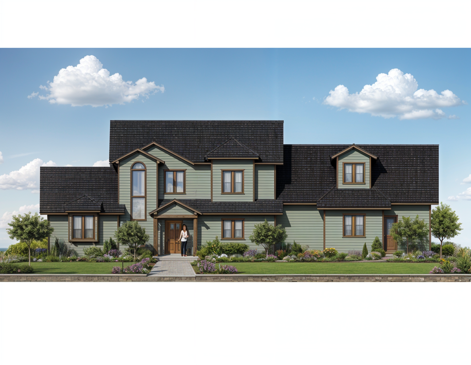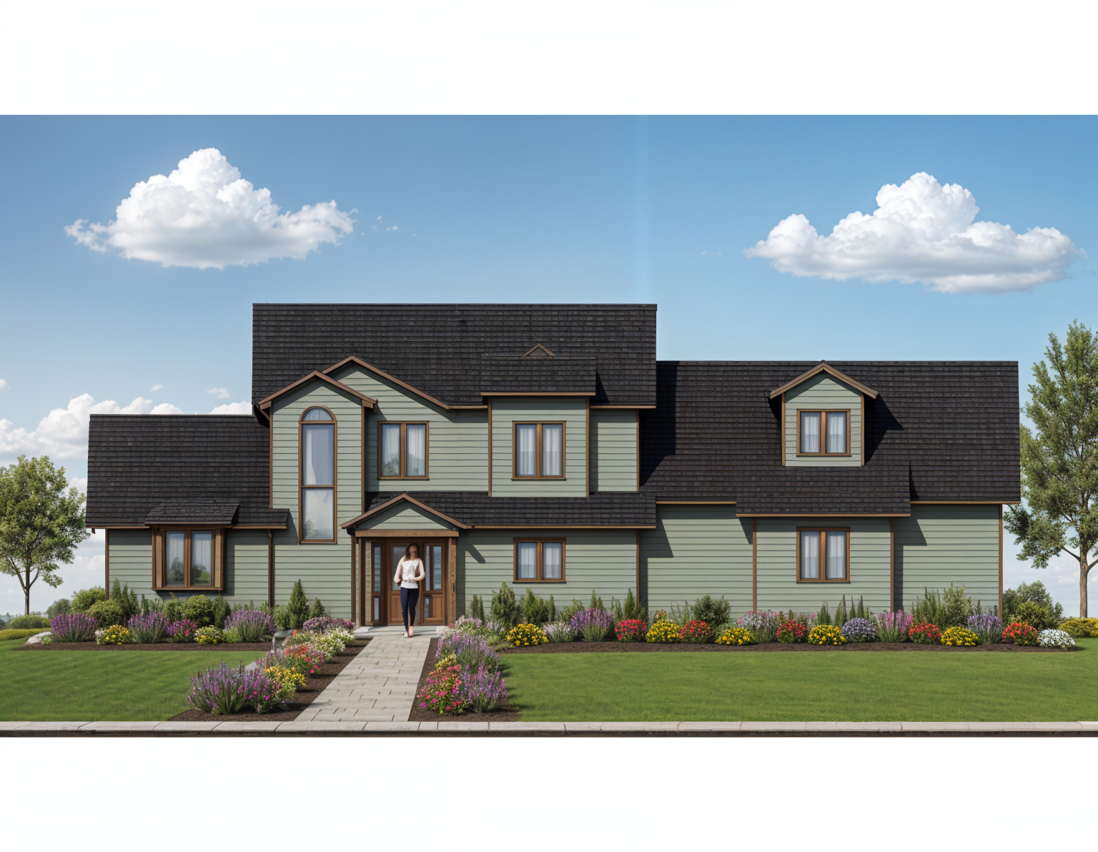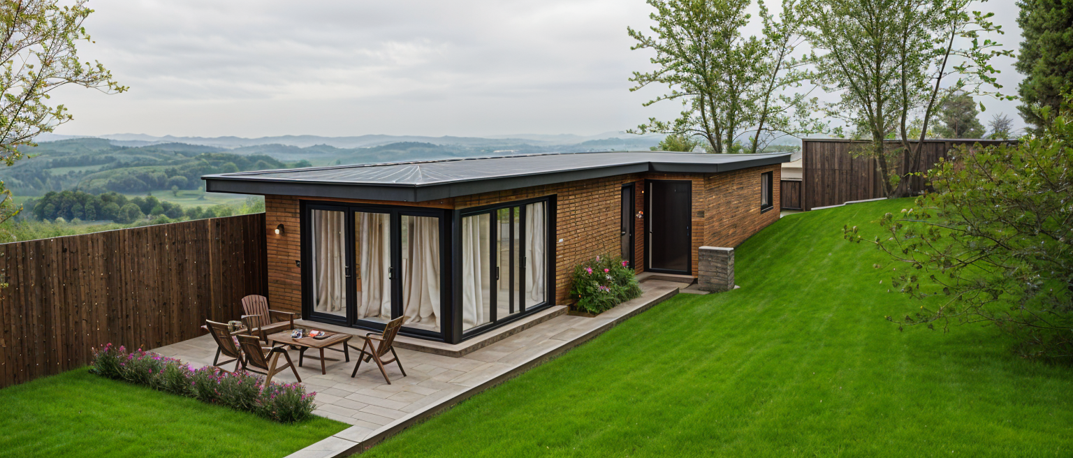 modern minimalistic house with a flat roof featuring large glass windows framed in sleek dark gray the exterior walls are a warm natural wood tone blending seamlessly with the surrounding environment a cozy patio with a small wooden table and chairs is adorned with a few cushions and placed on a smooth neutral gray pavement the surrounding landscape features lush vibrant green grass with a row of neatly arranged red and pink flowers in the background tall leafy trees cast gentle shadows creating a serene and inviting atmosphere under a soft overcast sky