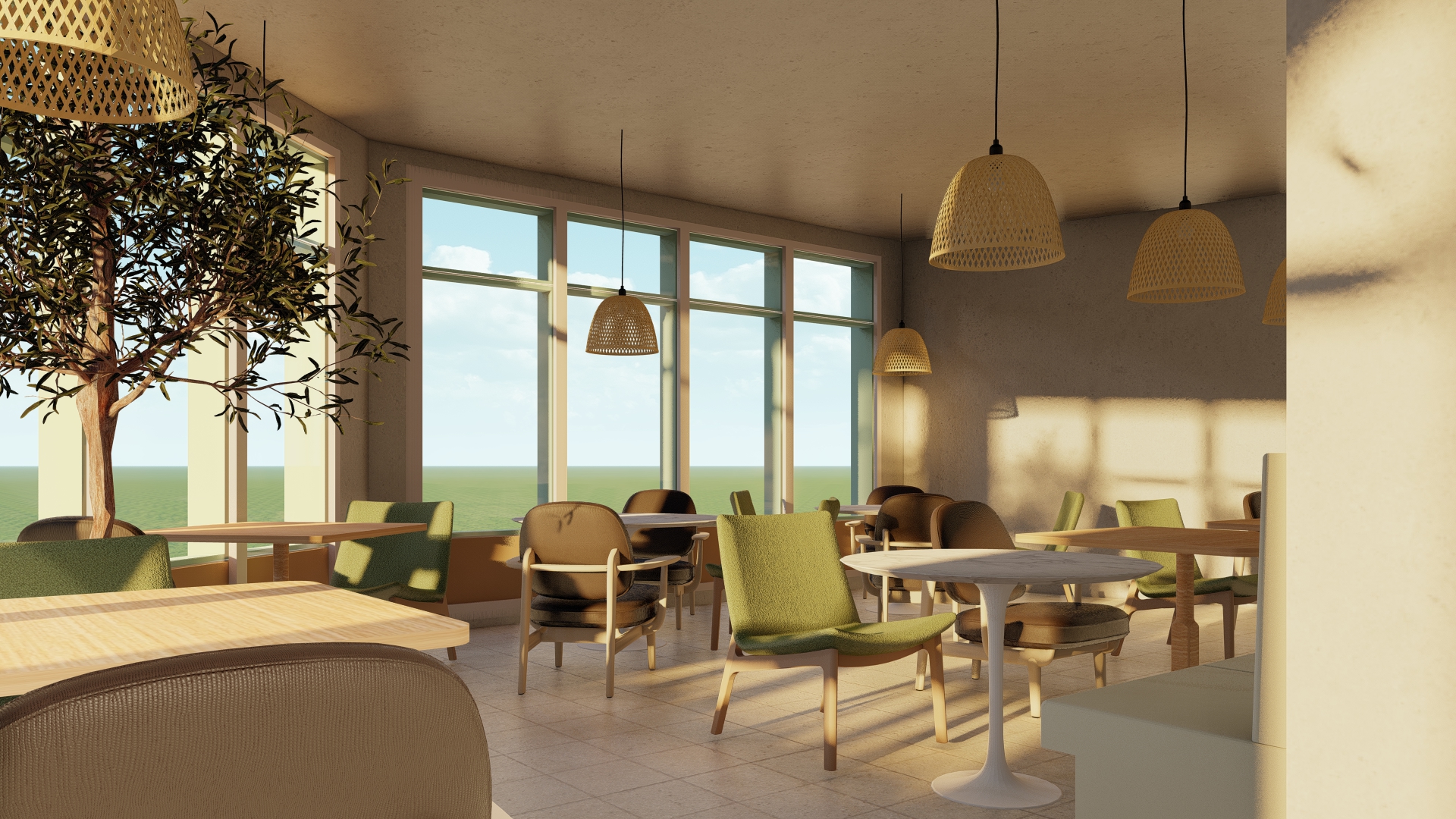 transform this base 3d model into a modern mediterranean tavern caf with authentic coastal charm keep the original geometry but enhance it with natural textures warm limestone walls aged wood beams and matte plaster surfaces add hanging greenery cascading from the ceiling olive tree planters and soft sunlight entering through open windows fill the wooden shelves with assorted wine bottles local spirits and small ceramic details use warm ambient lighting with golden tones and subtle shadows the style should combine rustic mediterranean tradition with modern minimalism natural materials elegant simplicity and artistic composition create a cinematic highly aesthetic and photorealistic atmosphere that feels calm timeless and inviting