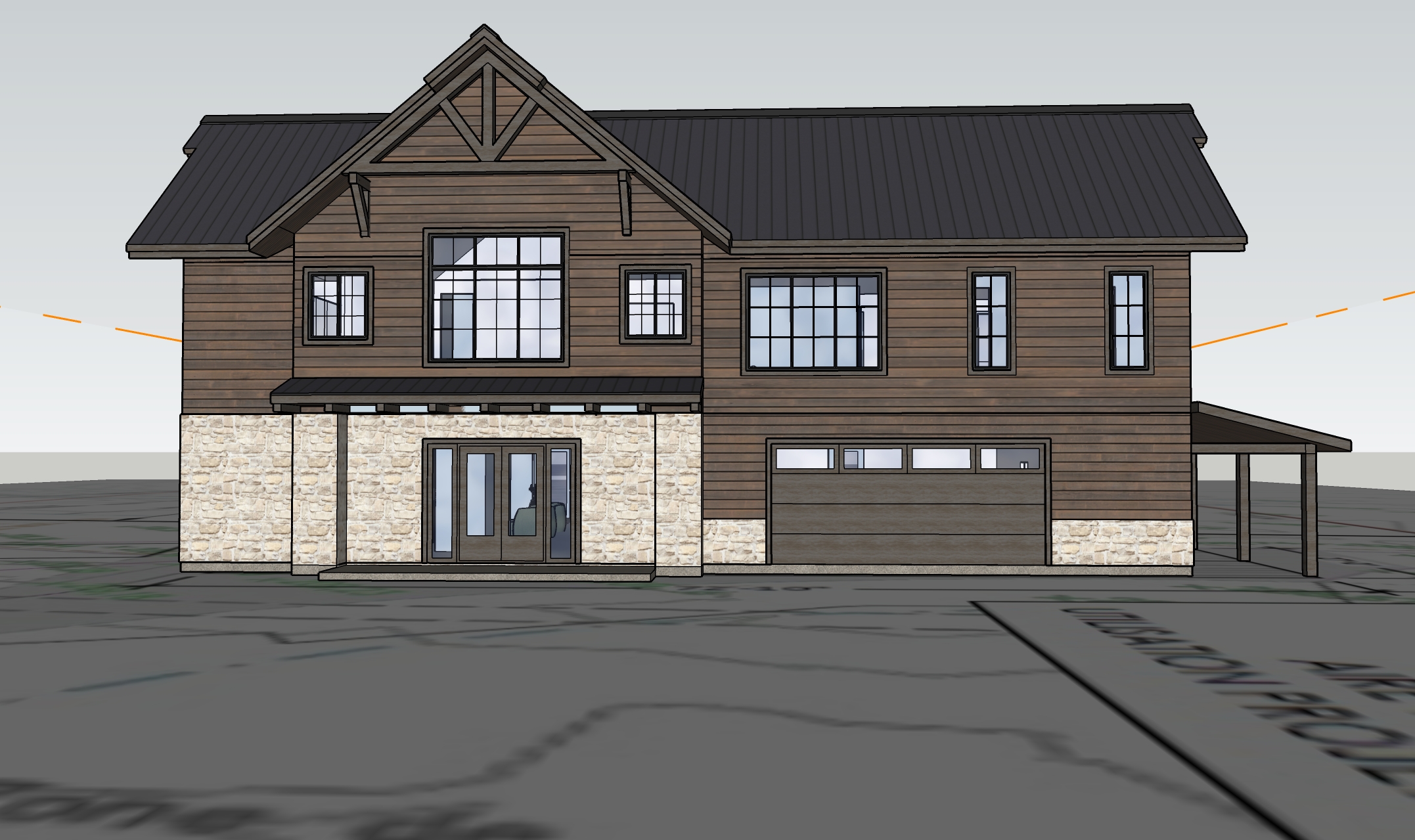 in the forest with farmhouse style garage door and car entrance coming from the left