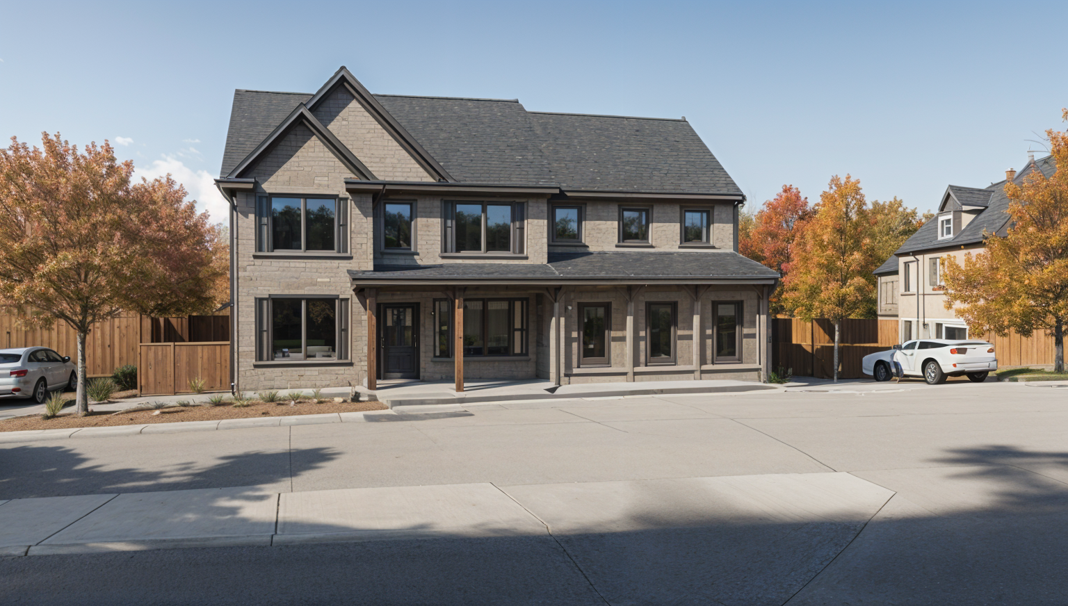 white vertical batten and board siding bronze frame windows wrought iron deck railing dark bronze facia dark bronze window trim architecture