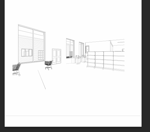 convert this exact interior market scene into a highly realistic late afternoon render keep all geometry exactly as shown same walls openings window sizes shelving layout carts floor and overall proportions transform the space into a warm neighborhood market similar to eddie s market or trader joe s wood accents small produce displays warm pendant lighting chalkboard signage and a friendly welcoming atmosphere add a few senior residents and community members shopping subtle natural poses not overcrowded through the large windows clearly show my activated urban alley string lights crossing overhead people walking flower shop activity small caf seating and warm evening glow keep the alley perspective aligned with the window angles do not alter the building exteriors just place realistic life and lighting in the alley overall tone warm urban community centered detailed baltimore style