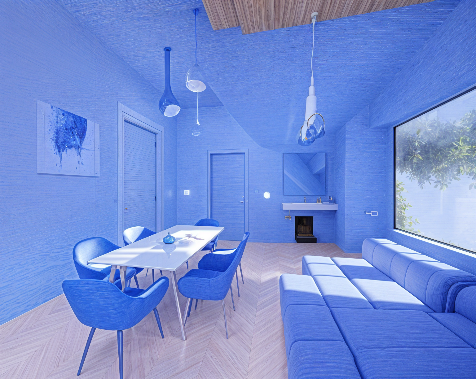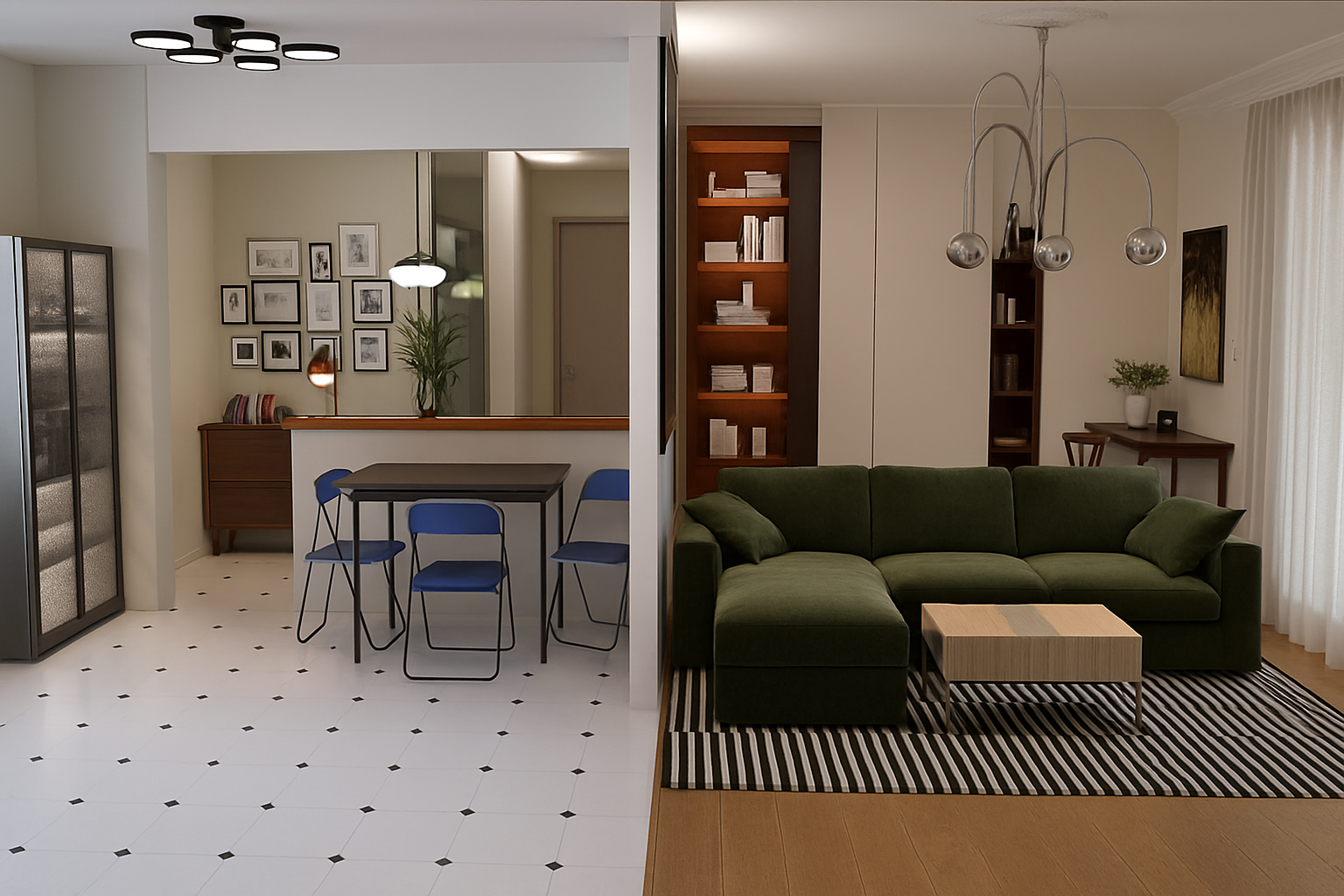 ultra high resolution photorealistic rendering of a modern single story house with a dark vertical wood exterior and a black metal roof the structure features a centered gable porch with two posts white framed windows and a white double front door there is an attached garage with matching white doors on the left retain all proportions materials and architectural dimensions exactly as shown surround the house with a lush green forest background tall trees and sunlight shining brightly through the branches casting soft natural shadows on the building and ground include a concrete pathwalk extending from the entryway and wrapping around the house the lighting should feel warm and realistic with detailed textures depth and subtle reflections for a true to life exterior visualization