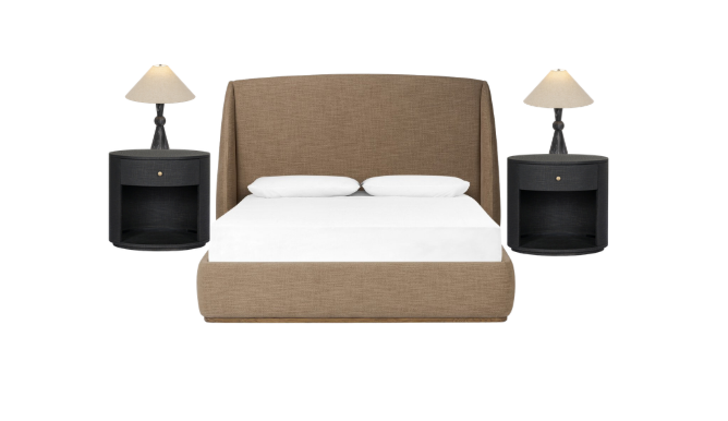 create a cozy modern bedroom with brown walls and light oak floors place a cream rug under the bed use image as a reference for furniture place a small vase with pink flowers on one of the nightstands us e beautiful cream linens and pillows on the bed