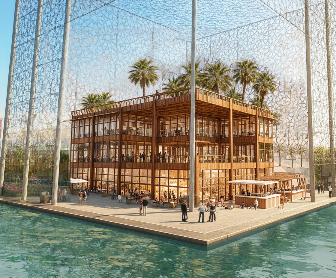 keep everything exactly as it is make the atmosphere slightly more ethereal and luminous with a warm golden hour lighting inside the building add warm interior lights to enhance the cozy and lively feeling preserve the morphology scale and all existing details