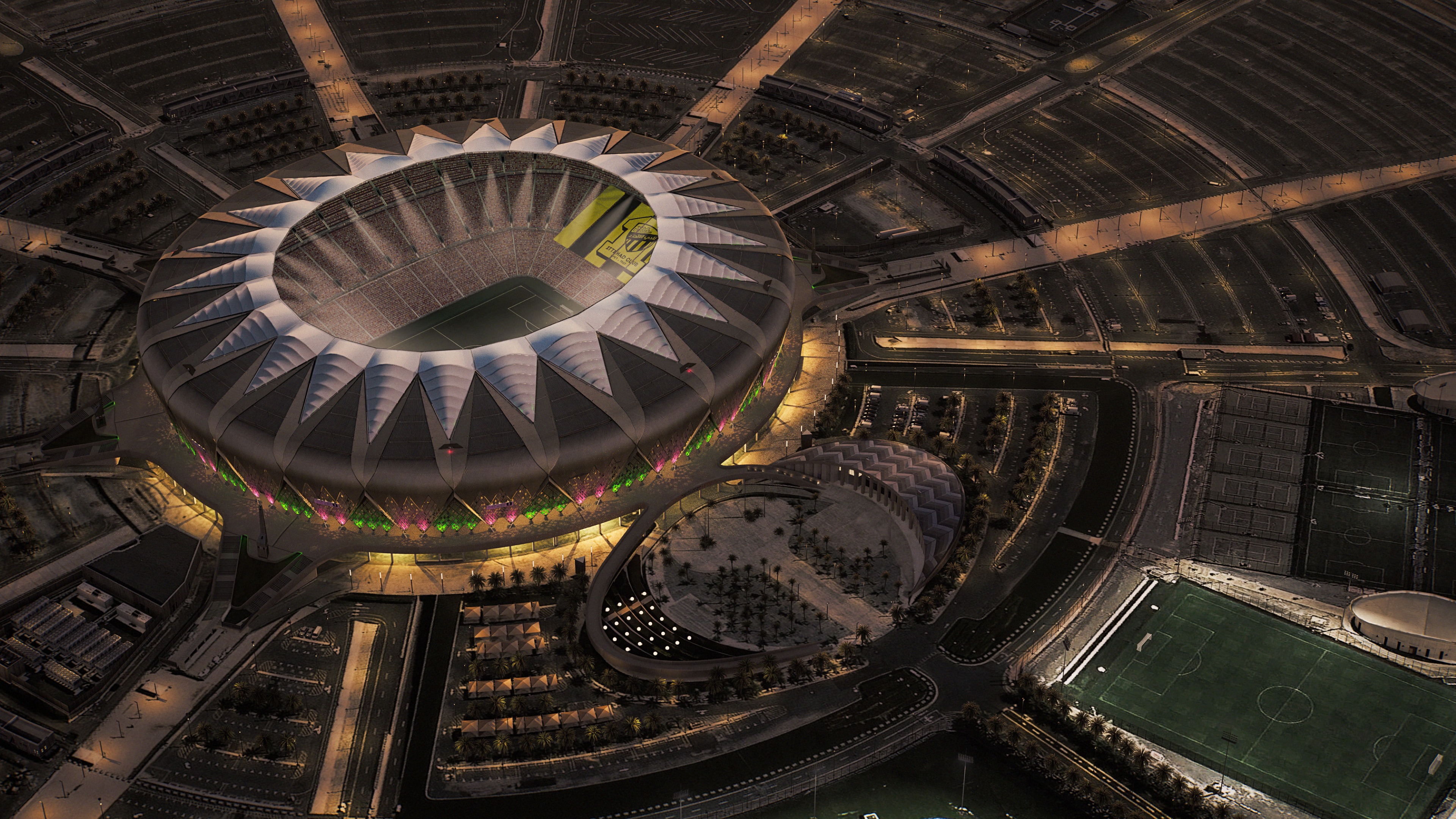 aerial view of a modern stadium at night featuring a futuristic design with a radial pattern of triangular roof panels the stadium is illuminated in soft white and vibrant colors with pink and green lights along its exterior casting a warm glow surrounding roads and parking areas bathed in the golden hue of streetlights enhancing the urban atmosphere adjacent facilities and green sports fields visible adding depth to the scene the overall mood is dynamic and energized showcasing a bustling city landscape