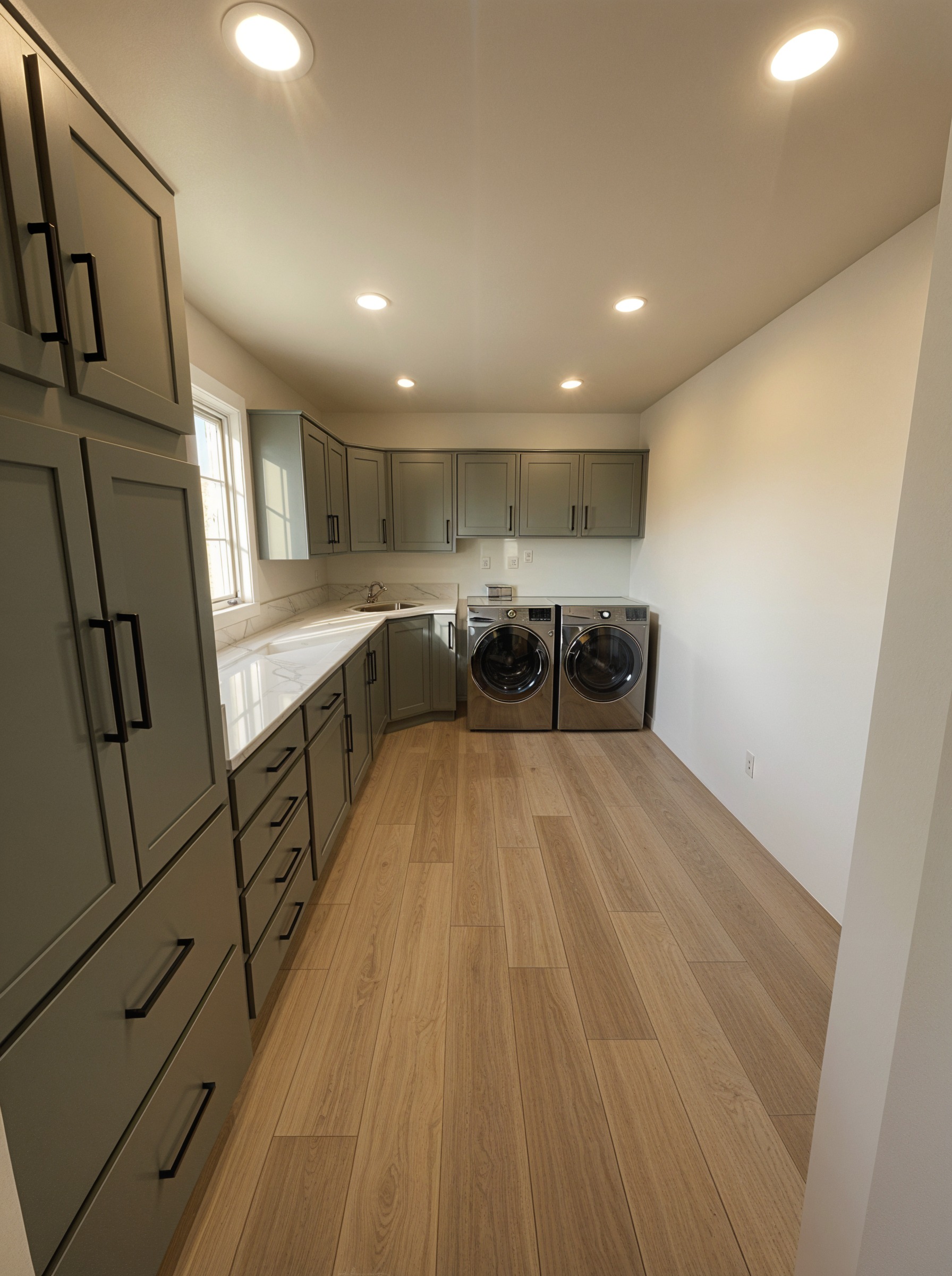 do not change the structure or layout of this laundry room replace the black handles with brushed nickel