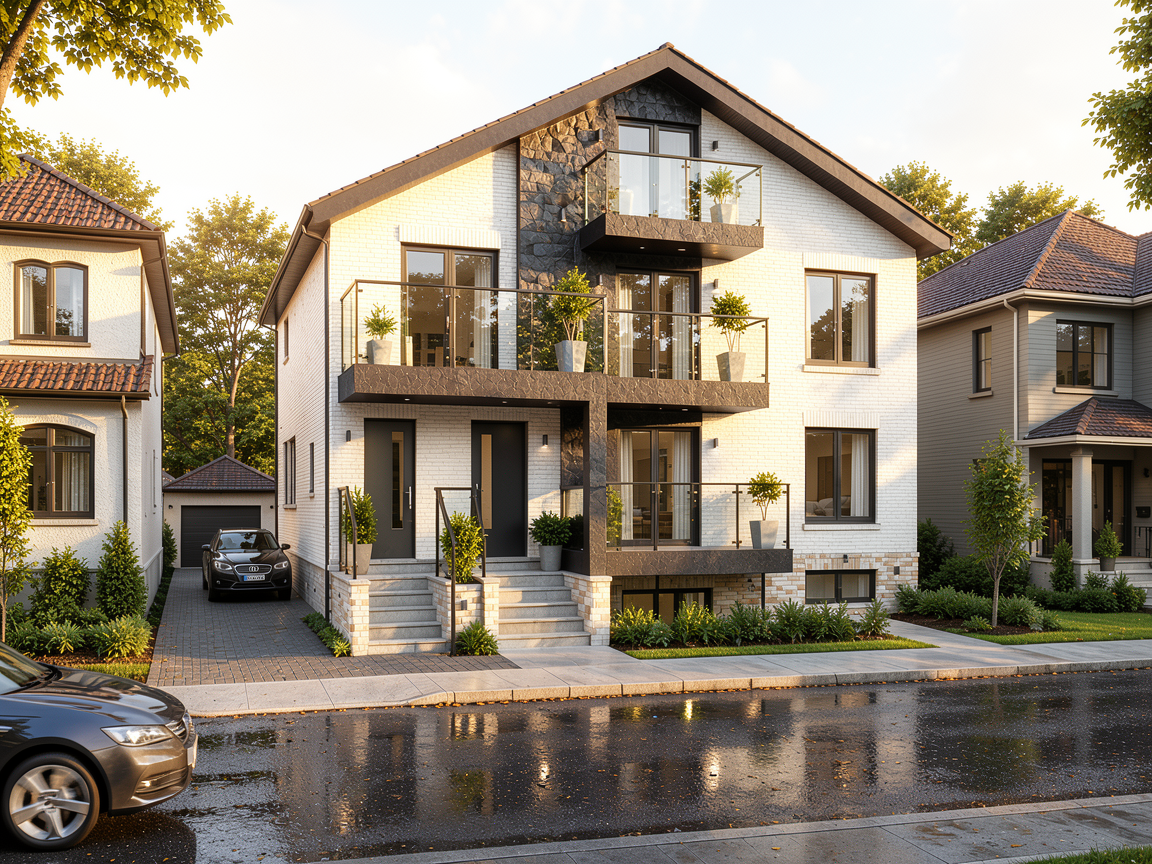 partly cloudy sky some deciduous trees in background concrete driveway add gutters and downspouts