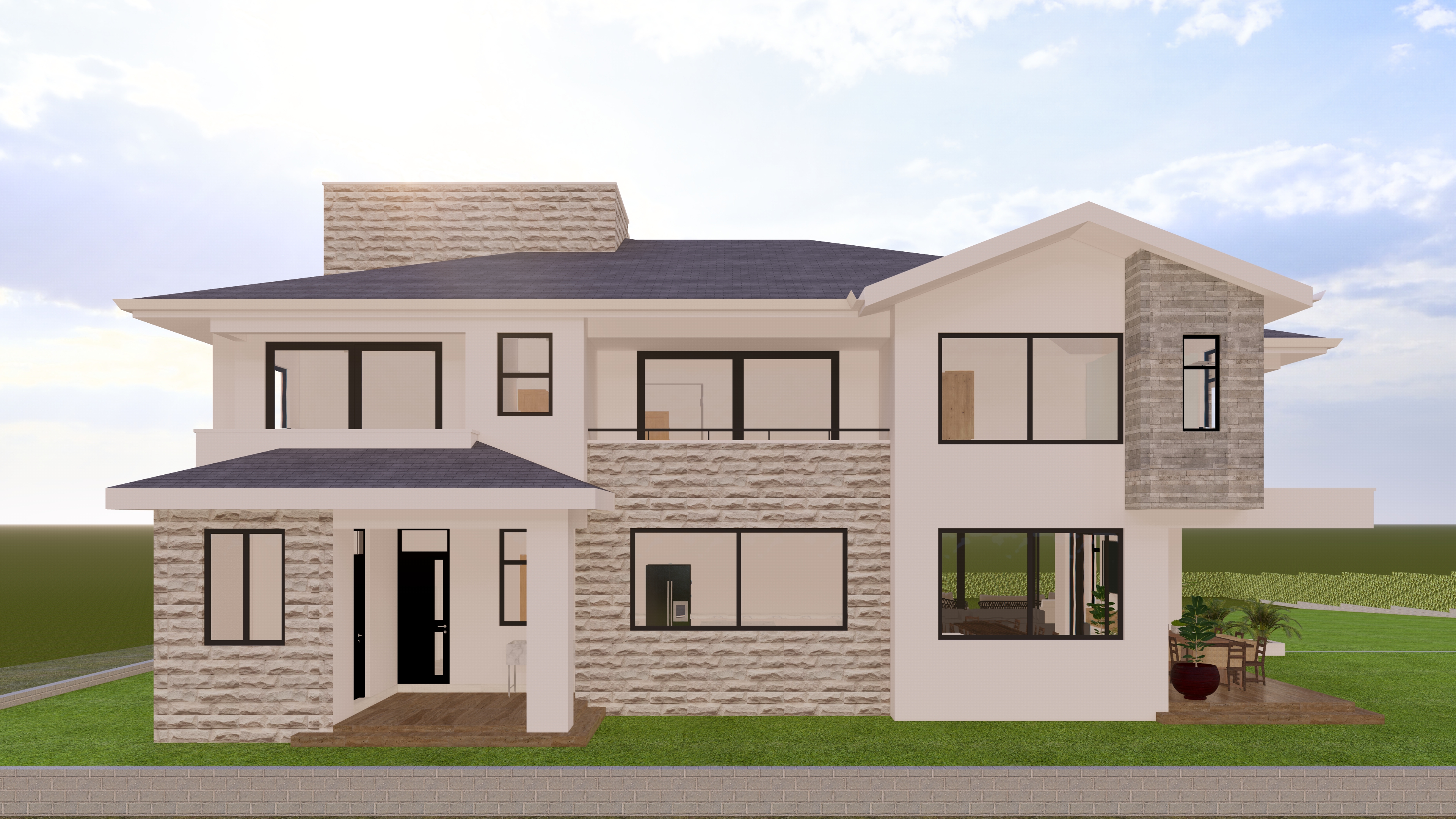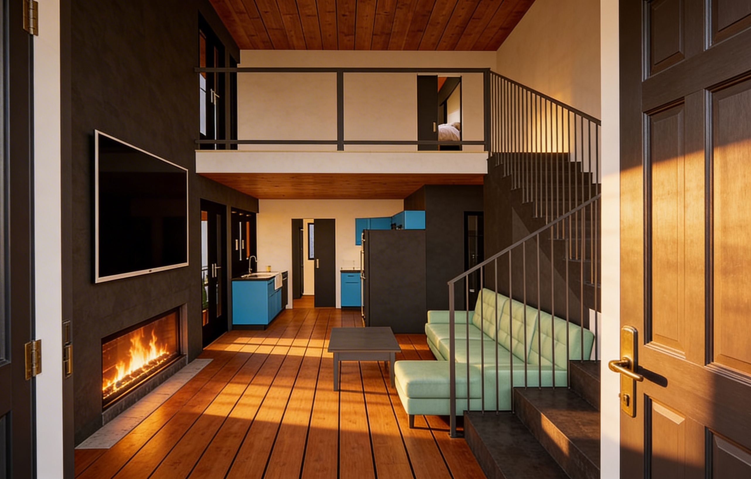 add very few trees and vegetation in background to give context add creamish white interior warm lighting