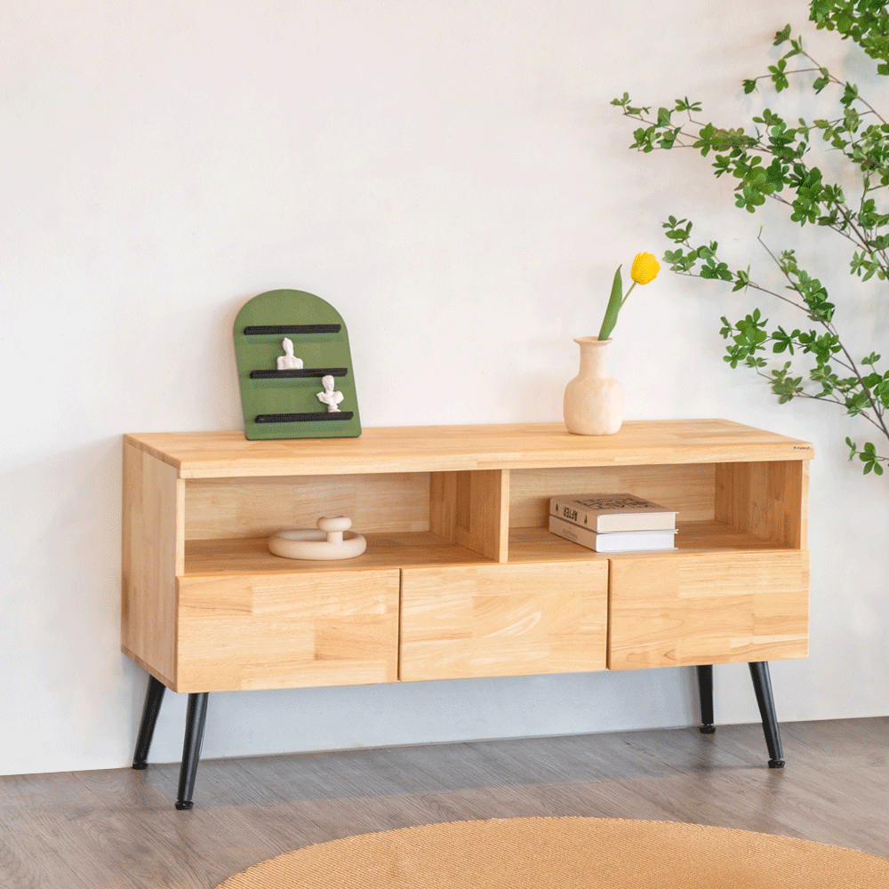 add a warm modern living room background that complements the light wood tv console use soft neutral wall tones such as warm white beige or light grey paired with light wooden or matte cement flooring for a clean and cozy atmosphere include gentle natural daylight coming from a nearby window to create realistic shadows that highlight the wood texture and warmth of the console place a floor lamp beside the tv console you can also put a tv screen on the tv console and the size of the tv same big as the tv console do not alter the design or angle of the tv console itself but you can change the wood material of the tv console to be america oakwood natural colour