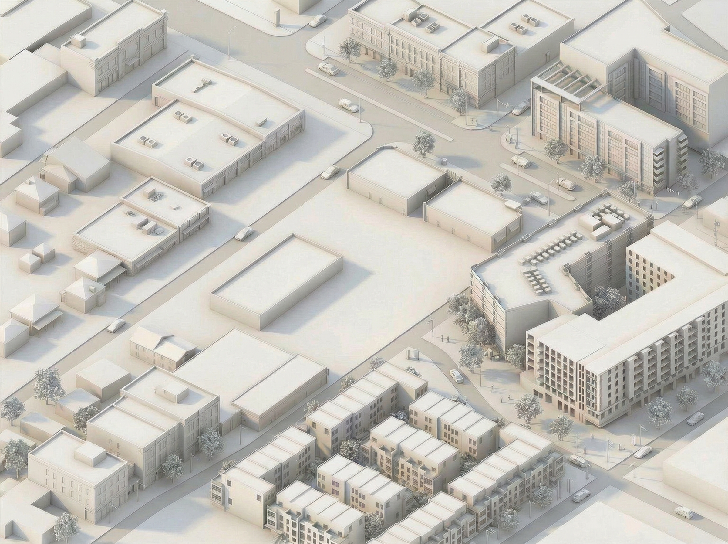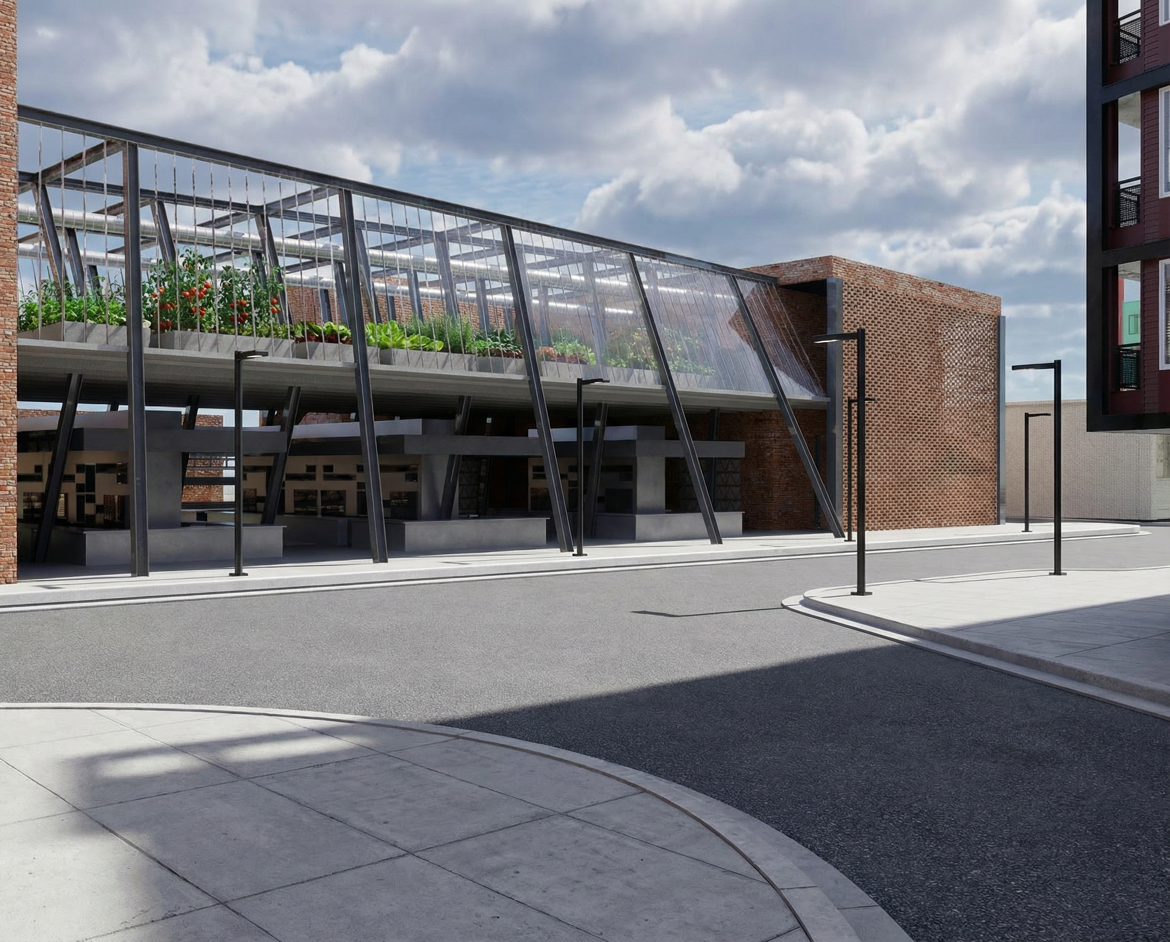 make plants a darker green and make it kinda artsy architecture aesthetic render with newer materials also take away modern streetlights and replace them with acorn streetlights
