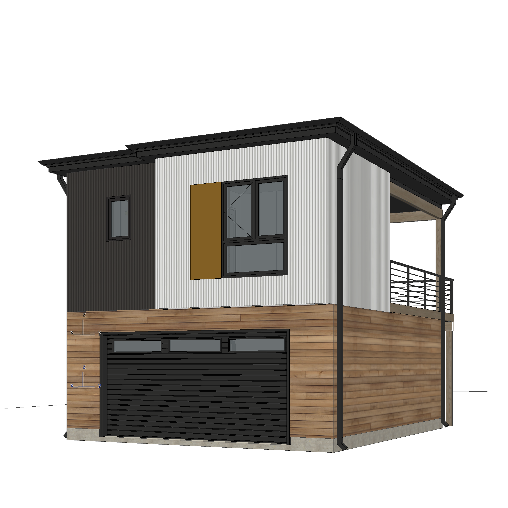 render a photorealistic 3d perspective of this house in a backyard with a house in the background reference the current material style just enhance them keep model geometry the same windows doors roof walls garage door make a grassy vegetation and young leafy trees do not change the view only enhance the current materials and make the landscape nicer vegetation detailed textures in the wood siding and glass reflections and a vibrant clear sky with light atmospheric depth render in hyper realistic architectural visualization quality 8k resolution add a concrete driveway at the garage door