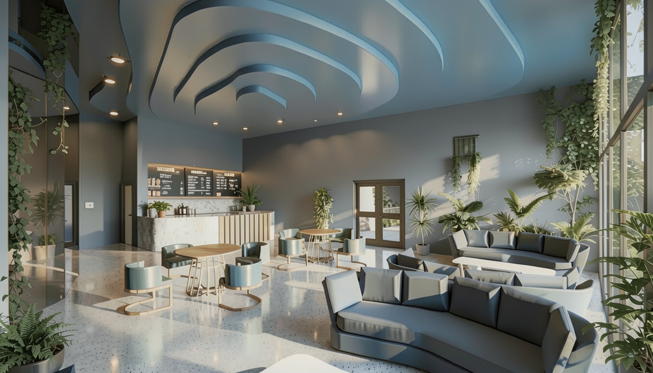 create a stunning architectural rendering of a modern retail space with a sleek industrial atmosphere use polished concrete floors in light gray combined with high ceilings featuring exposed steel beams painted in matte black the retail area should have large glass windows with black metal frames allowing natural light to flood the interior incorporate soft warm lighting with led strip lights in soft white enhancing the welcoming ambiance for the back of house apply a minimalist design with white walls and minimalist functional furniture in light oak include accents of greenery such as potted plants to add a touch of nature the bathroom should feature modern fixtures using stainless steel and white porcelain with subway tile walls in glossy white overall maintain a clean elegant look emphasizing the contrast between the industrial elements and the sleek finishings