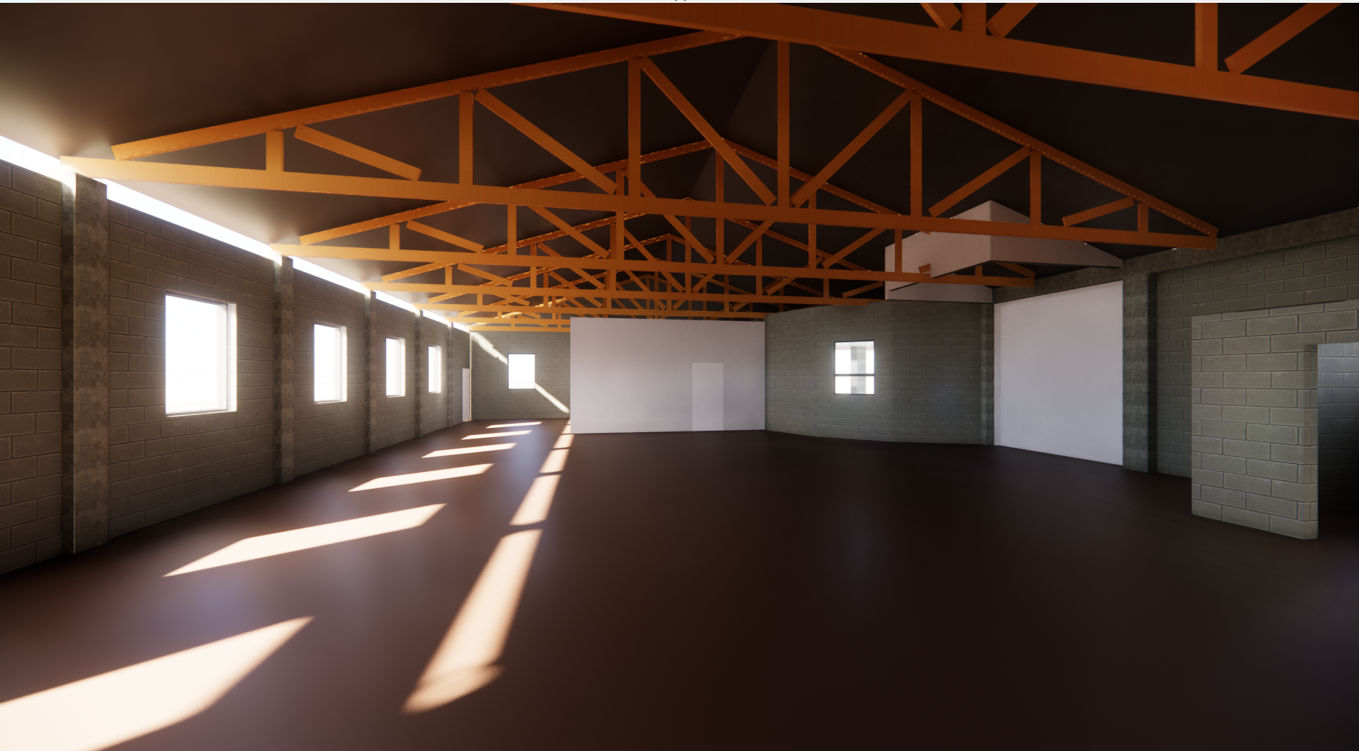 sustainable design interior shot base image input use provided interior image as base maintain original camera position proportions and spatial geometry core architectural preservation retain and emphasize all existing architectural elements including exposed steel roof trusses preserve color and rhythm masonry cmu block perimeter walls existing window openings and daylight patterns overall volume and raw utilitarian character do not introduce finished ceilings drywall or polished architectural upgrades the space should feel authentic preserved and minimally altered floor treatment existing concrete slab repaired and stabilized but not replaced subtle patchwork visible matte finish with slight weathering natural imperfections retained design intent open air museum transform the space into an unconditioned open air interpretive museum focused on route 66 history and automobile culture hualapai tribe culture storytelling and regional identity the space should feel intentional but restrained not cluttered exhibit strategy introduce freestanding bronze display elements thick weather resistant bronze plates and pedestal forms etched with imagery maps and text not overly legible more atmospheric minimal number of exhibits carefully spaced some angled some vertical varying heights for visual interest designed to withstand sun dust and rain no digital screens no delicate materials cultural sensitivity tone integrate subtle references to hualapai storytelling through patterns symbols and composition avoid overly literal or themed graphics respectful quiet and grounded approach lighting atmosphere natural daylight only no artificial lighting fixtures warm desert light entering from windows and openings strong light and shadow contrast across the floor slight dust haze in air to catch light beams activation include a small number of people to bring life to the space visitors casually walking reading exhibits reflecting diverse ages keep figures understated and secondary to space material palette concrete existing repaired bronze primary intervention material cmu block steel trusses no additional finishes like wood flooring carpet or polished metals overall mood quiet contemplative and grounded industrial ruin meets cultural preservation minimal curated and timeless rendering style photorealistic soft depth of field slight atmospheric diffusion warm color temperature architecture