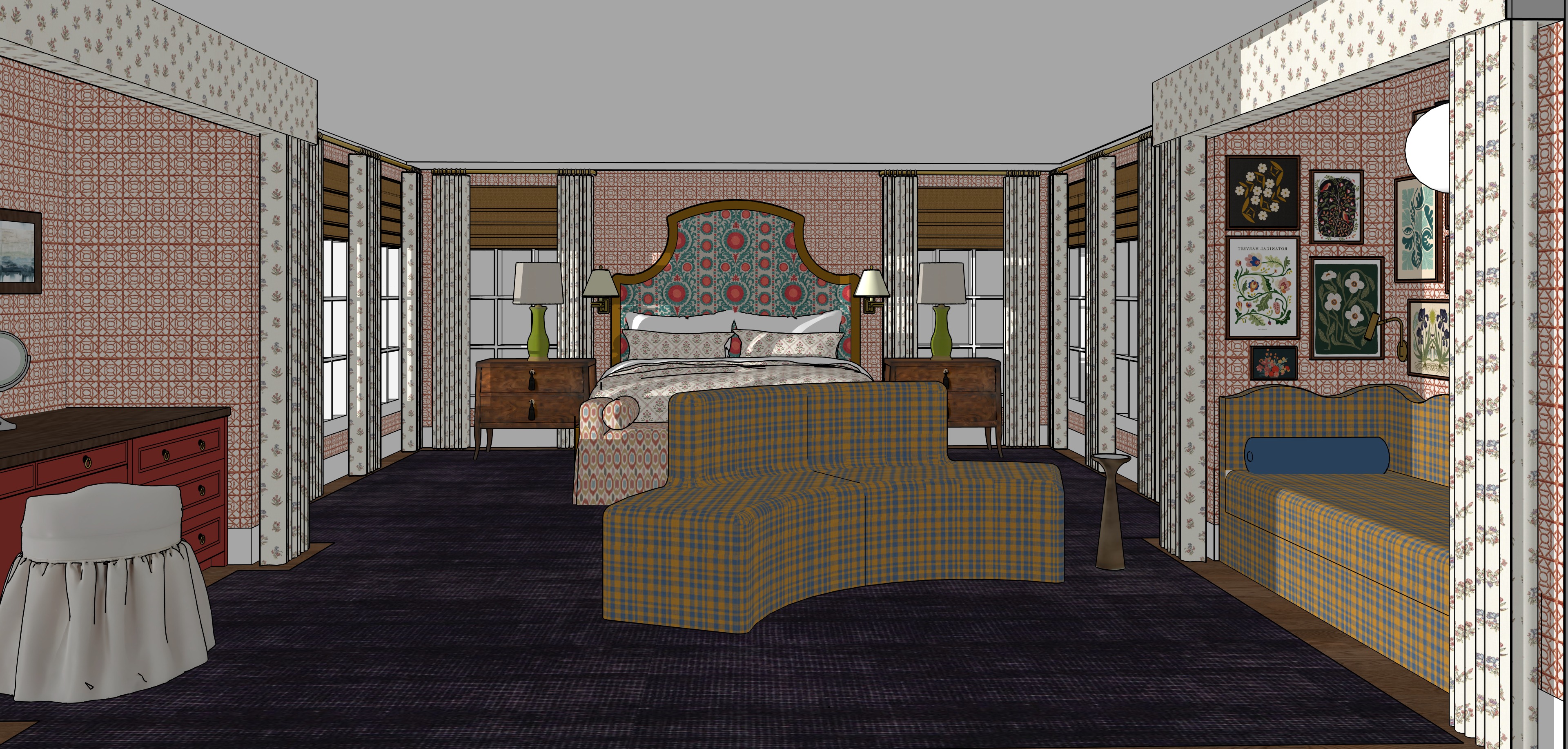the uploaded image is a finished sketchup interior scene with final materials already applied preserve the camera angle room layout and furniture placement exactly as shown all materials must remain unchanged including the fabric the upholstery the rug the fireplace surround the mantel and the wood flooring do not reinterpret fabrics colors or textures enhance the image by adding realistic lighting shadows and material depth only to create a photorealistic architectural rendering strict preservation keep all fabrics patterns colors and materials exactly as shown material fidelity required