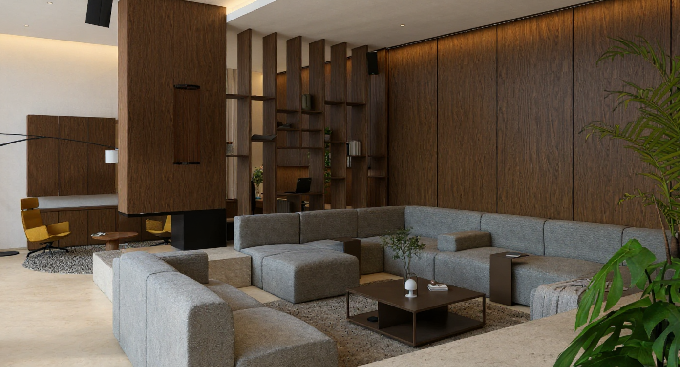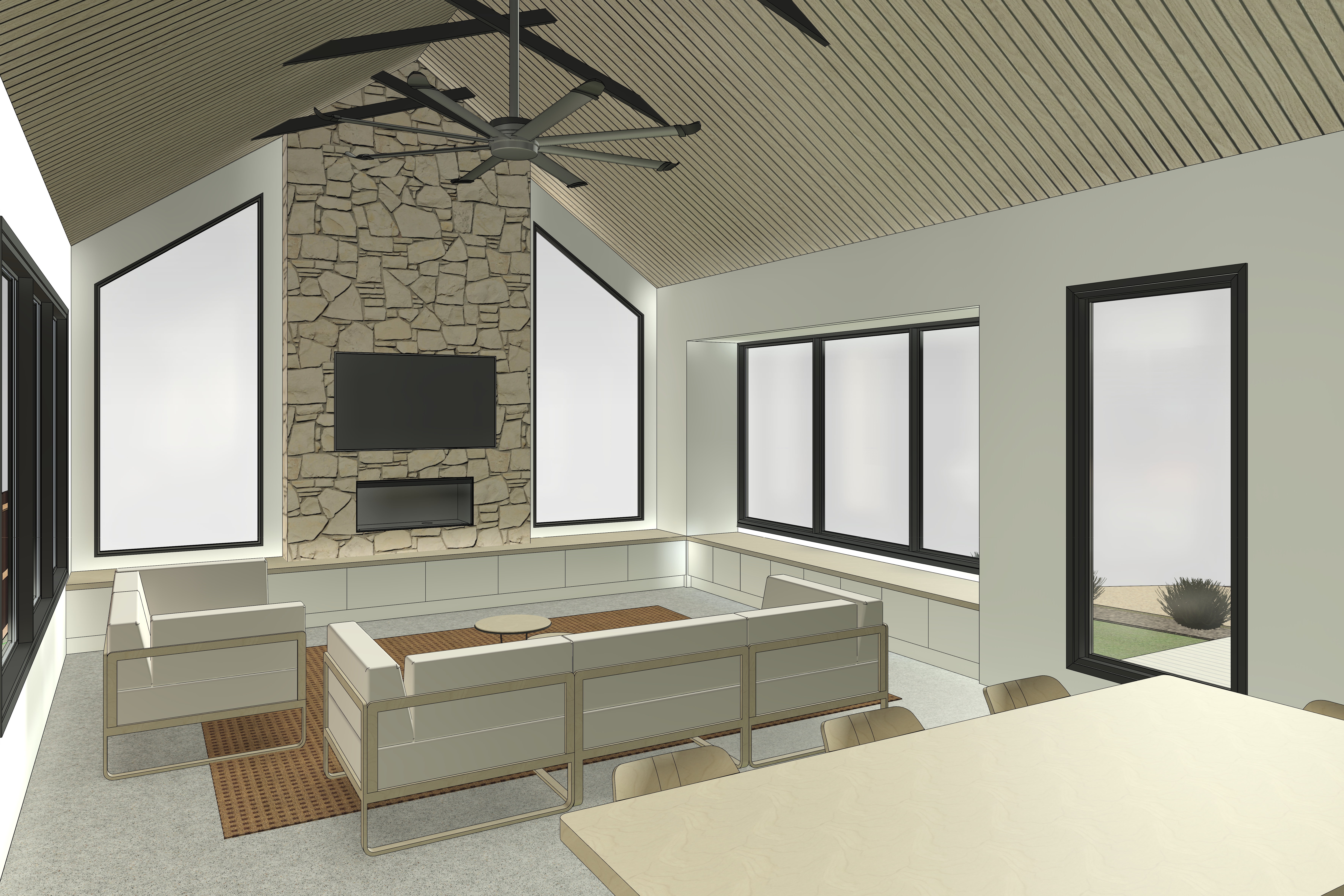 modern living and dining bright and vibrant natural light beach themed colors with dry stone cladding around fireplace and tv hanging on wall timber joinery with timber bench tops timber panel ceiling lining and burnished concrete floors outlook onto front garden and lawn with large gum trees lots of natural light follow geometry of original image but make the output image ultra realistic location australia victoria
