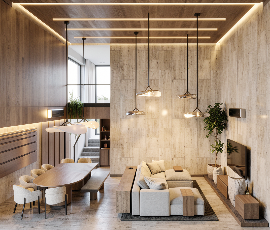 preserve the existing image exactly no changes to geometry layout furniture desks glazing or camera allow additions strictly limited to the existing shelving system only no new shelves no relocation no objects elsewhere warm the lighting temperature slightly daylight feels softened and interior oriented highlights lose sharpness and gain warmth overall ambiance shifts from neutral to gently warm increase material texture and depth across the scene carpet reads denser and more tactile desk surfaces gain subtle micro variation concrete ceiling absorbs light more softly reducing flatness refine the planters to read as metal surface appears powder coated or anodized metal matte to satin finish with restrained sheen edges are crisp and architectural color deepens and desaturates industrial rather than decorative increase the number of books on the shelving books appear more abundant and continuous spines vary subtly in height and thickness colors remain muted and earthy off whites greys dark greens browns blacks no glossy covers no graphic typography books feel used and archival not styled some stacked horizontally others vertically slight irregularity allowed but overall order maintained reads as a working studio library not a showroom add restrained greenery between books plants are architectural and calm used as pauses within the shelving rhythm never overpowering the books maintain generous negative space shelves feel populated and weighted but never cluttered or decorative reduce overall exposure marginally bright zones stay luminous but controlled midtones deepen background gains calm visual weight enhance spatial depth without contrast exaggeration foreground feels grounded and present perspective recedes smoothly and quietly maintain a serious quiet high end office atmosphere editorial mature composed archive atelier energy no trendiness no lifestyle styling