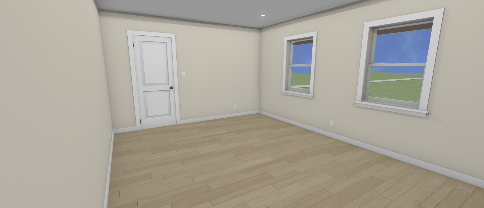 ultra photorealistic high resolution interior render of the existing room retain all architectural features dimensions proportions scale and camera perspective exactly as shown including wall layout ceiling height crown molding recessed ceiling light wall color baseboards door size and position window size and trim electrical outlets and light wood plank flooring pattern and scale no structural dimensional or layout changes add at least one complete working office setup accurately scaled to the room a modern office desk ergonomic office chair computer monitor or laptop keyboard mouse desk lamp and minimal cable management position the office setup naturally within the space without blocking doors windows outlets or circulation paths keep the setup realistic clean and functional modify only the exterior view through the windows replace the background with a lush green forest landscape dense foliage tall trees and bright sunlight filtering through branches creating soft natural highlights and realistic daylight interaction inside the room window frames and glazing remain unchanged use physically accurate materials realistic lighting and shadows soft global illumination true to life color balance and natural reflections maintain a professional architectural visualization style with sharp detail and depth 8k resolution photo realistic realism no stylization no added d cor beyond the office setup