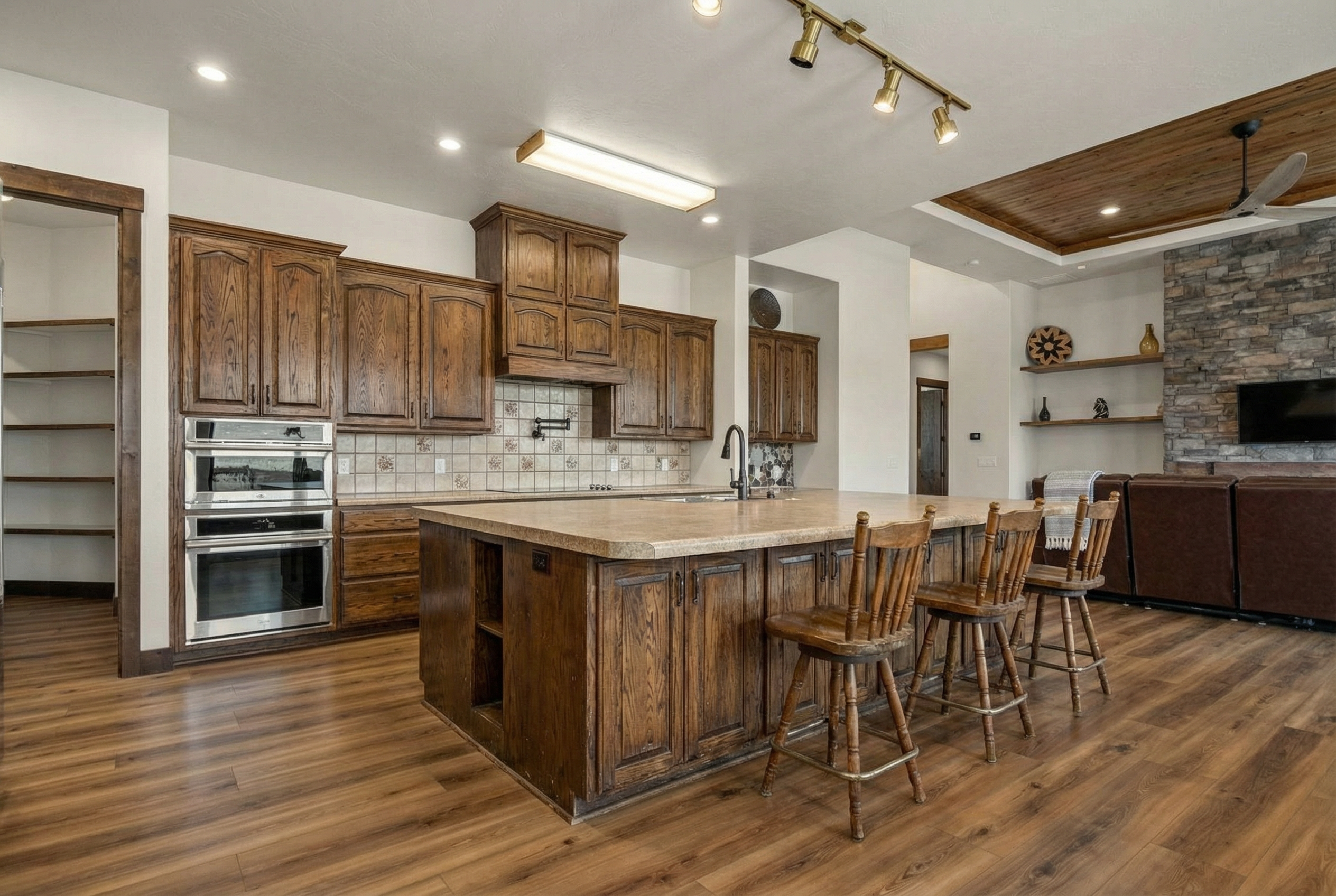 create a before image of this exact kitchen make the cabinets look outdated the reference image is the after image for this kitchen transformation the cabinets should be early 2000 s style white cabinets