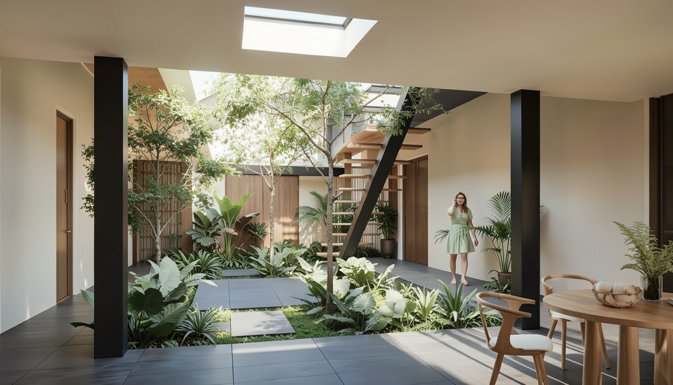 modern zen interior courtyard garden minimalist architecture landscaped garden with large natural stones and sculptural rocks carefully placed small ornamental trees bonsai style clean gravel and soil composition subtle stepping stones integrated in the ground calm and balanced composition japanese inspired design open covered patio with black columns floor to ceiling glass walls soft natural lighting neutral tones serene atmosphere luxury residential courtyard architectural visualization photorealistic ultra detailed 8k