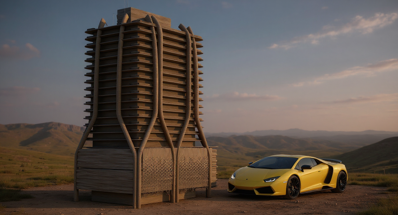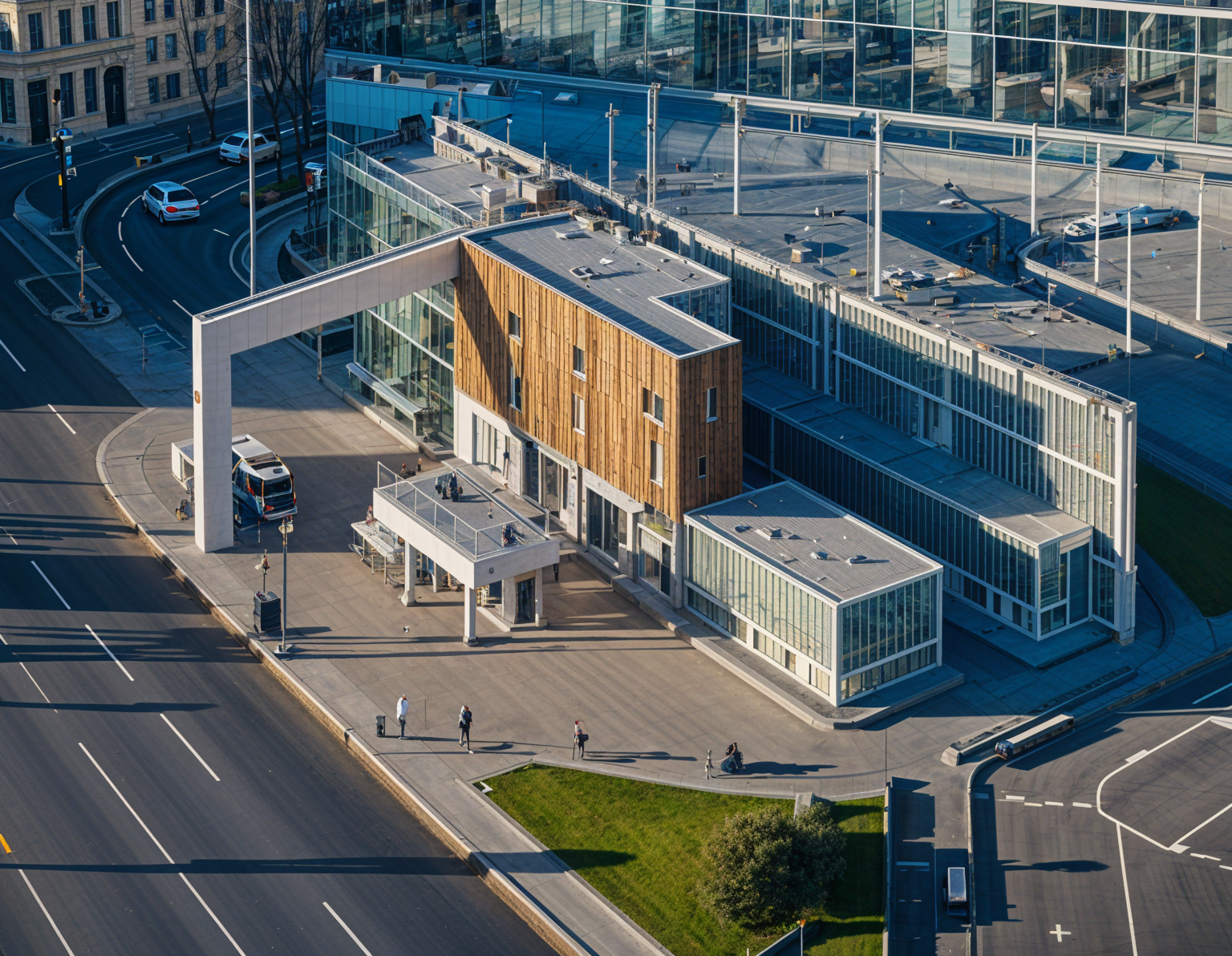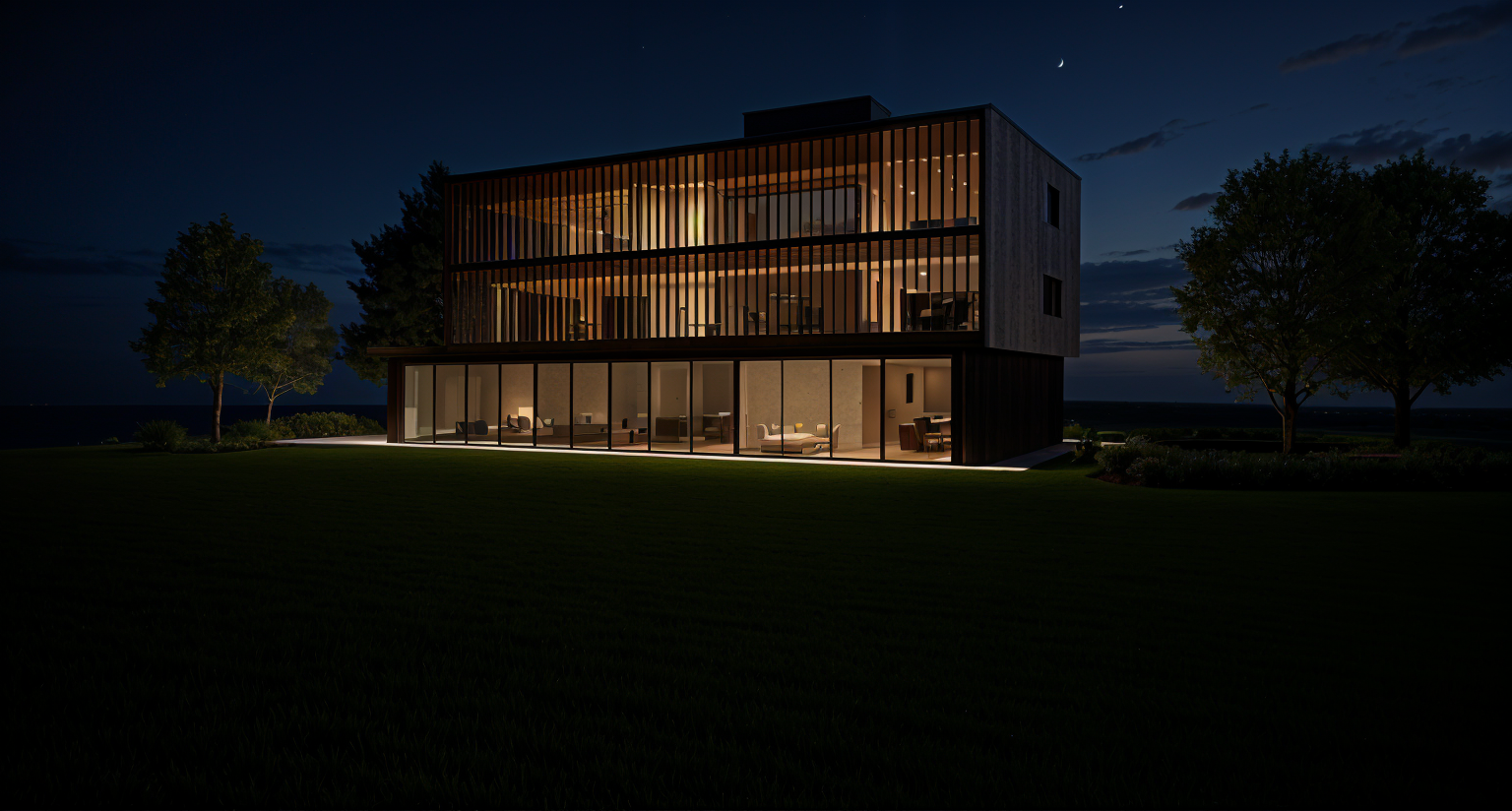 turn the image into an evening scene at dusk blue hour make the landscaping more realistic and add interior lighting add office furniture but don t change the building itself