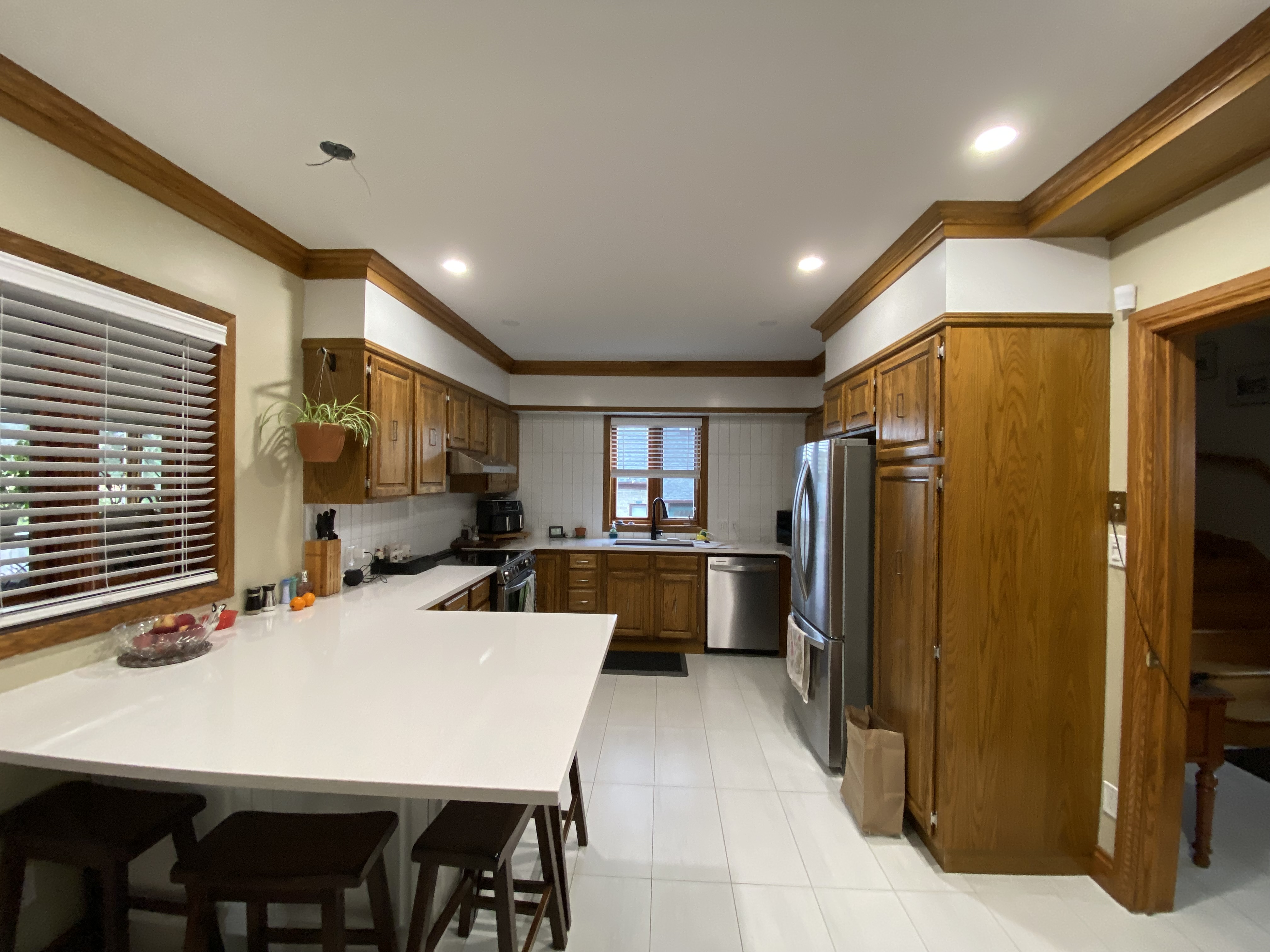 add a thin profiled wooden molding matching the color tone and grain of the existing upper kitchen cabinets place it horizontally at the bottom edge of the white upper band directly above the cabinets following the full perimeter of the kitchen the molding should appear seamlessly integrated with the existing woodwork with the same warm oak texture and satin finish keep it subtle about 1 to 1 5 inches tall with a delicate ogee or slightly rounded profile adjust shadows and reflections for perfect realism maintaining the current lighting and photo perspective