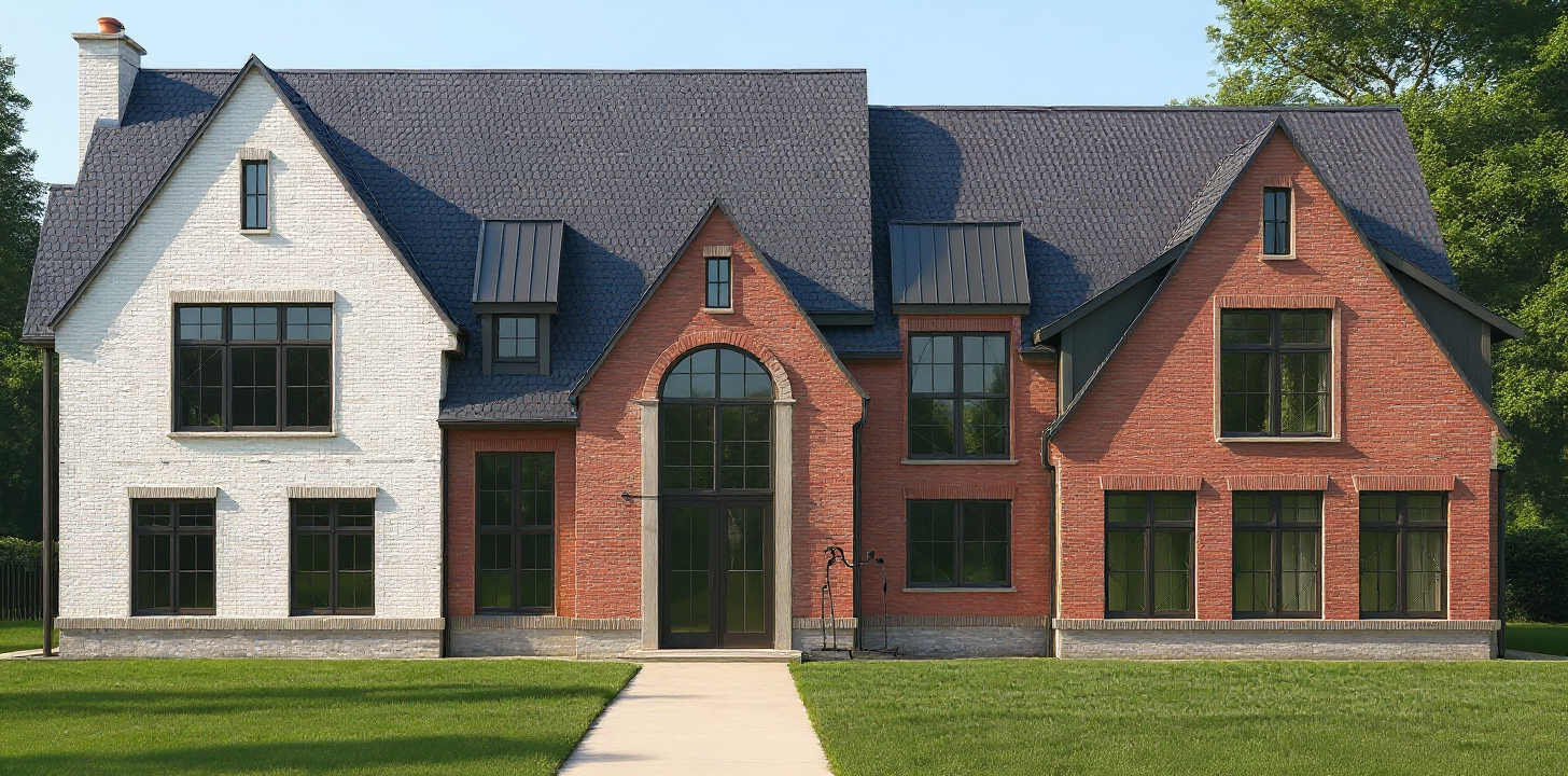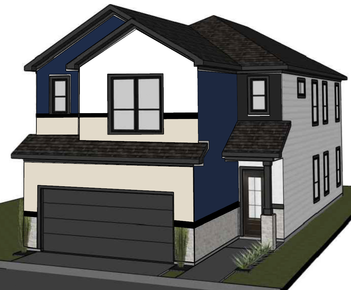 exterior shot create a photorealistic render of this house design using the first image as the architectural base match the lighting color palette and realistic textures of the second image the house should have a modern urban contemporary style with white smooth stucco walls dark charcoal trim and windows and black roof shingles add natural daylight illumination around 5 30 pm houston central time with a warm tone use soft landscaping similar to the second image small green plants ornamental grasses and a few trees in the background keep a clean sky with light clouds and ensure balanced shadows and reflections for a high quality photorealistic finish the garage and front door should remain black matte with metal or wood texture detailing background environment should resemble a suburban neighborhood with similar modern houses nearby negative prompt avoid exaggerated colors night lighting heavy contrast cartoonish or unrealistic textures and overly saturated greenery