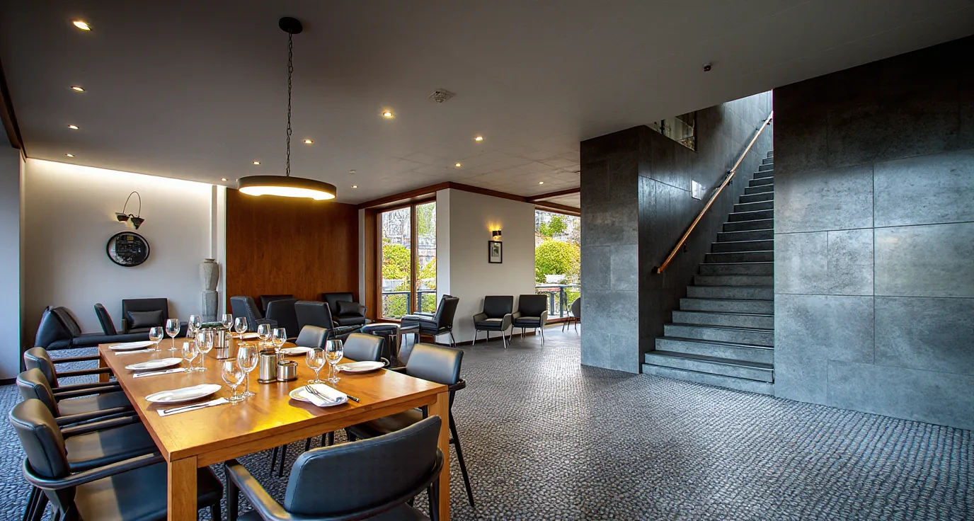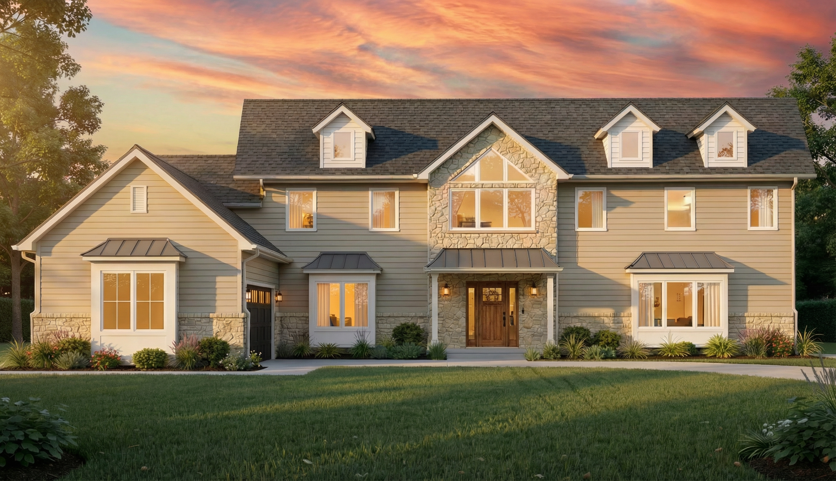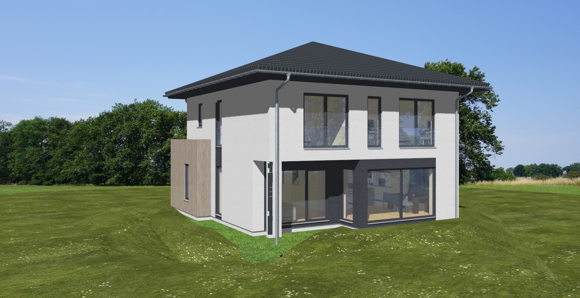 render this house photorealistically the fa ade consists of grey brown surfaces and white plaster the protruding fa ade on the ground floor has a dark brown attic covering position the house in a park like setting surrounded by tall green trees under a bright blue sky with scattered white clouds capture a welcoming and peaceful atmosphere and emphasise the harmonious connection between contemporary architecture and nature